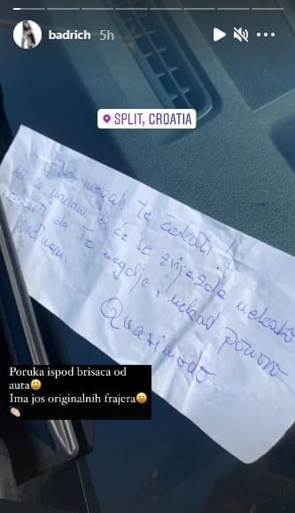 Nina Badrić na Instagramu je objavila fotografiju poruke ispod brisača koju je uočila dok je boravila u Splitu.