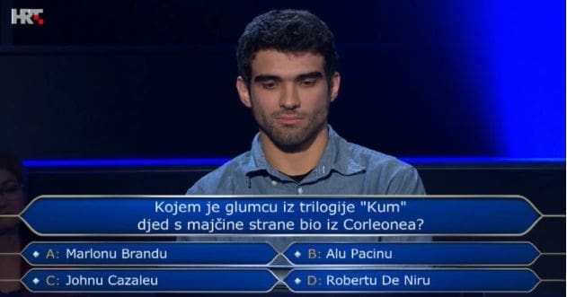 Fabijan je naglasio kako mu se čini da bi to mogao biti De Niro te je ne odugovlačeći, lišen namjere da odustane, odabir njegova konačna odgovora bilo upravo ime te glumačke legende. Nakon još jednoga voditeljeva pljeska zaslužena hrabrom igrom, natjecatelj je saznao da je holivudskome veteranu Alu Pacinu djed s majčine strane bio iz spomenuta sicilijanskog mjesta. Stoga je svoj upečatljiv nastup Fabijan zaključio s osvojenim iznosom drugoga praga.