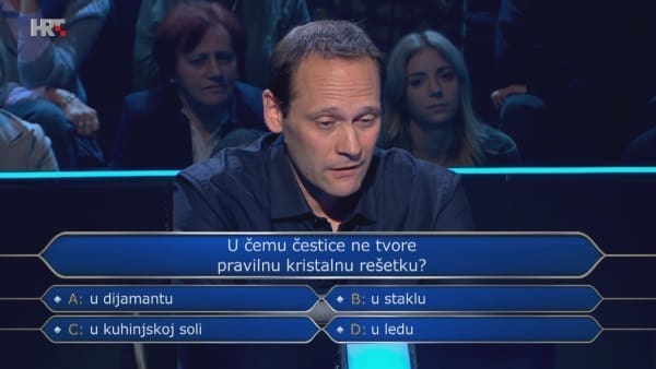 Prvo je bilo ono za prelazak drugoga praga. Čestice ne tvore pravilnu kristalnu rešetku u dijamantu, staklu, kuhinjskoj soli ili ledu? Glasilo je 10. pitanje na kojemu je, ne bi li dobio suženi izbor ponuđenih odgovora, zatražio džoker "pola-pola". Nakon što su ostali dijamant i staklo, Zvonimir se odlučio za staklo i osvojio 32.000 kuna.