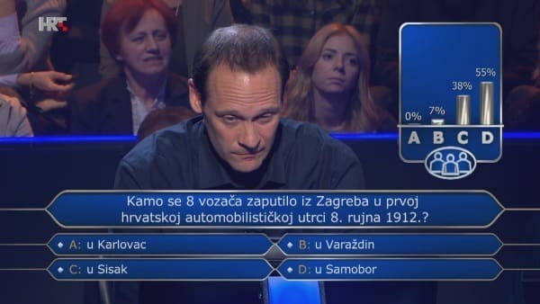 Je li se osam vozača zaputilo iz Zagreba u prvoj hrvatskoj automobilističkoj utrci 8. rujna 1912. u Karlovac, Varaždin, Sisak ili Samobor? Bilo je to pitanje za četvrt milijuna kuna na kojemu je ispucao posljednje džokere. Prvo je zatražio pomoć publike, a ona je najviše glasova, 55 posto, dala Samoboru. Potom je upotrijebio i džoker zovi koji mu je, čuvši pitanje, simpatično izjavio - Morat ćeš drugi džoker iskoristiti.