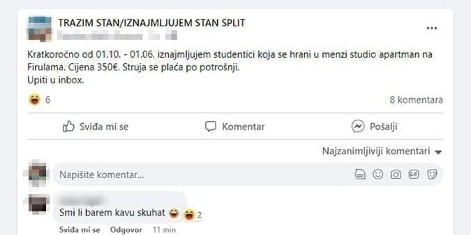 "Kratkoročno od 01.10. - 01.06. iznajmljujem studentici koja se hrani u menzi studio apartman na Firulama. Cijena 350€. Struja se plaća po potrošnji. Upiti u inbox", napisao je.