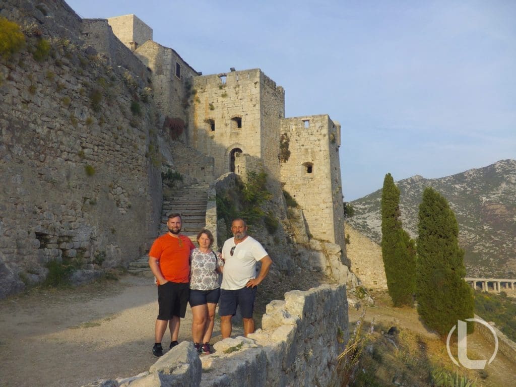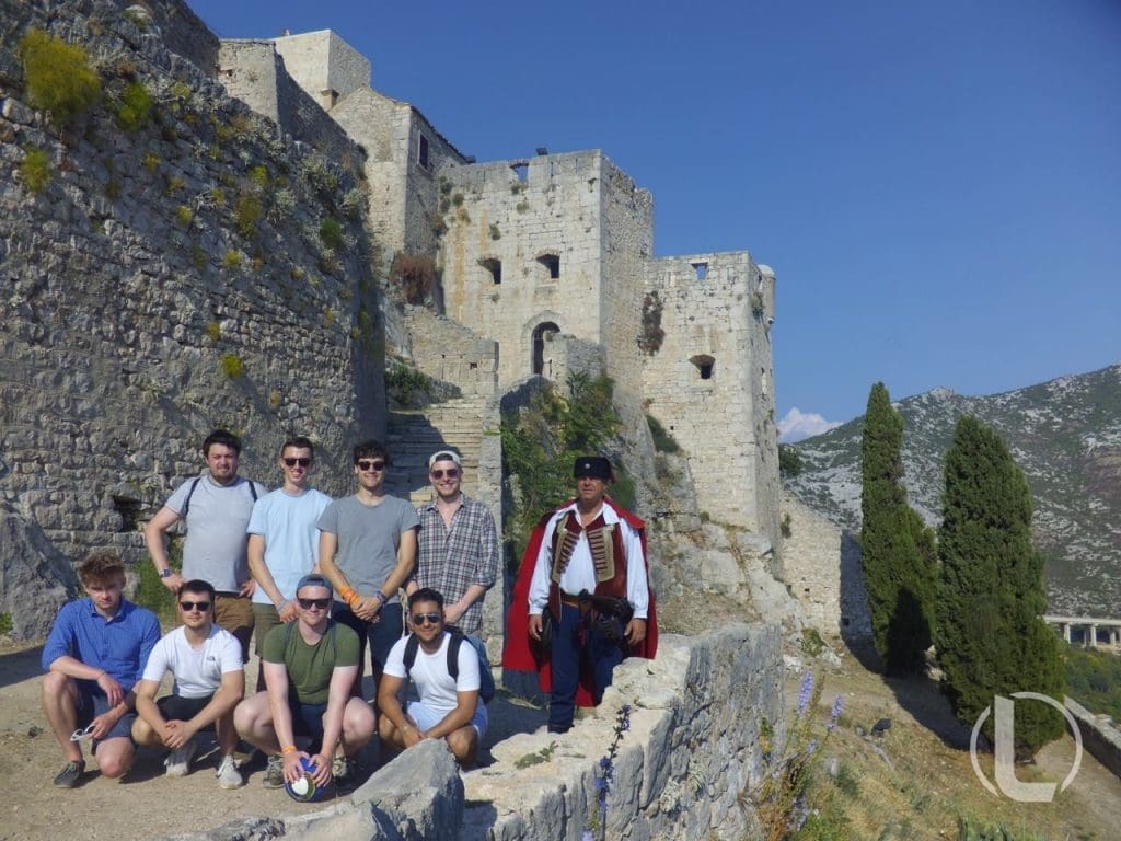 Pogledajte mladu grupu Engleza kako poziraju s Uskokom koji je element proširene stvarnosti naše kamere na Tvrđavi Klis.