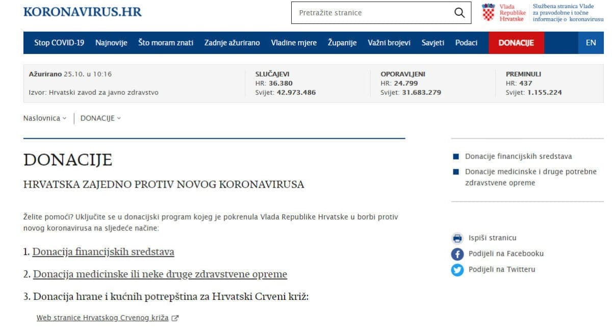 Jučer se na stranici koronavirus.hr se pojavila nova rubrika, označena kao “Donacije”. Kada se klikne na nju dolazi se do službene objave Vlade koja poziva građane da se uključe u donacijski program u borbi protiv novog korona virusa. Ponuđene su tri opcije kako se može donirati.