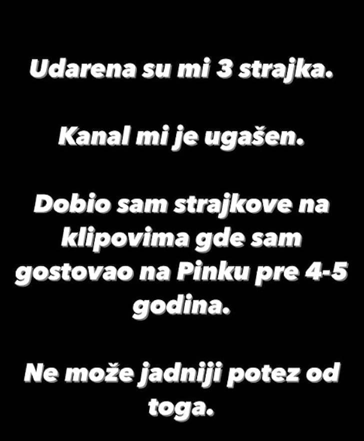 Podsjetimo, Iliću je kanal na ovoj platformi ugašen nakon sukoba s vlasnikom TV Pinka Željkom Mitrovićem.