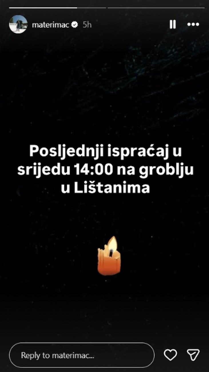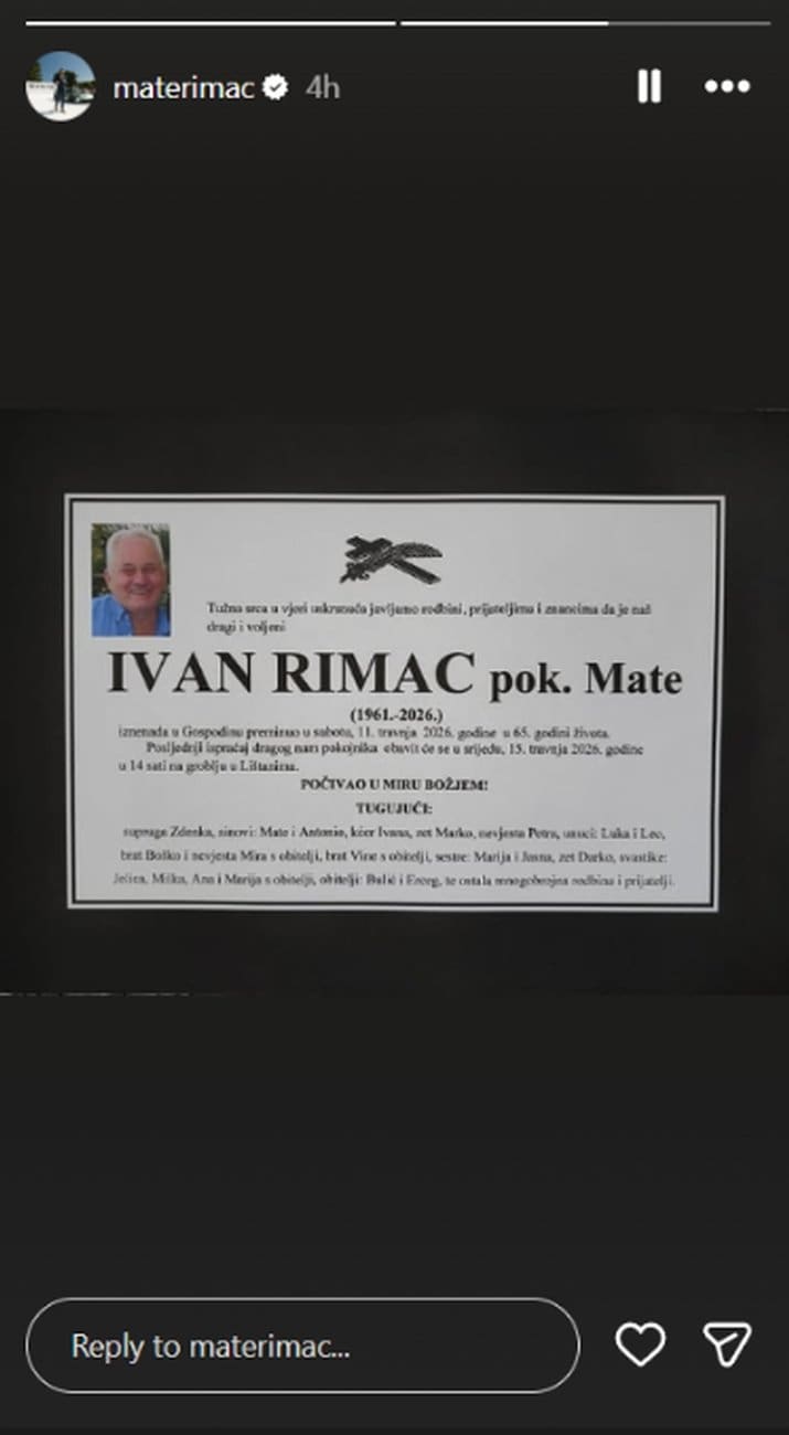 Uz objavu osmrtnice, Mate Rimac kratko je naveo kako će posljednji ispraćaj biti održan u srijedu u 14 sati na groblju u Lištanima.