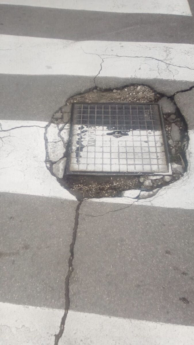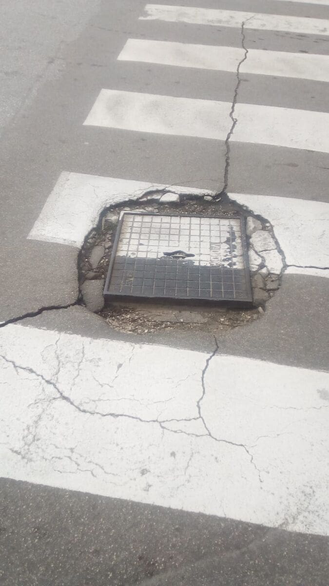 Asfalt se oko šahta potpuno urušio, stvarajući desetak centimetara široku rupu koja stvara probleme i pješacima i vozačima.