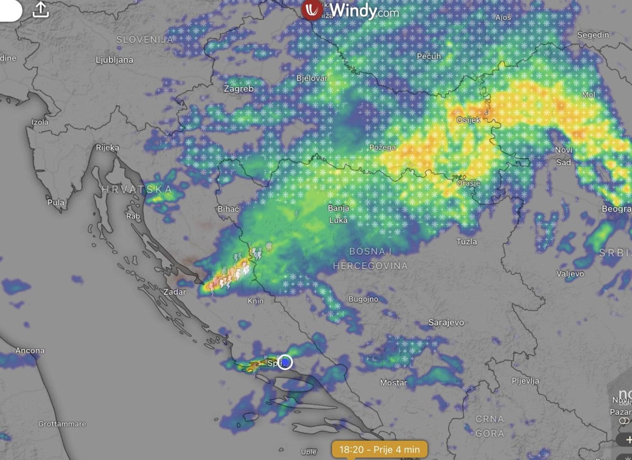 U večernjim satima snažne nestabilnosti zahvatile su zadarsko zaleđe, a olujni sustav proširio se i prema splitskom području, gdje su zabilježeni pljuskovi, grmljavina i lokalno intenzivne oborine.