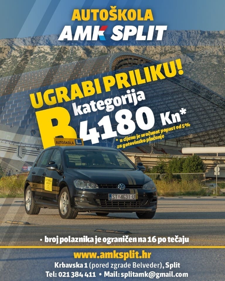 - B kategoriju sam upisao na nagovor roditelja, posebno jer sam vidio da je kod Autoškole AMK Split trenutno jako zanimljiva akcija za 4180 kn. Odmah sam primljen, zaveden u sustav te sam dobio sve što mi treba. Ludilo ekipa, dobro se zabavljaju, a kako vidim imaju i dobre rezultate. Uopće ne sumnjam da ću proći, samo se raspitajte, vrijedi svake kune, bacite oko na Face AMK Split, evo danas sam izašao sa fotkom na Poljudu, svaka čast ekipa - idemo dalje.
