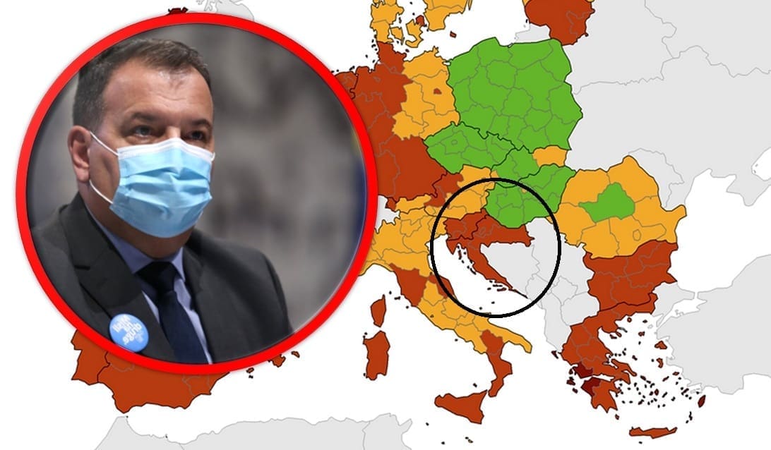 Europski centar za prevenciju i kontrolu bolesti ažurirao je u četvrtak kartu koja prikazuje četrnaestodnevnu zarazu na 100.000 stanovnika te tako rangira regije pojedinih država prema stupnju rizika. Na najnovijoj karti više nisu samo dijelovi Hrvatske u crvenom, već je cijela zemlja označena crvenom bojom.