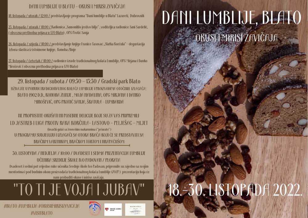 LUMBLIJA – to ti je voja i jubav. Sa tim je možda najbolje predstaviti program koji 25. listopada započinje u Blatu na Korčuli. Iako u svom naslovu nosi ime Lumblija, program je puno više od predstavljanja ovog tradicionalnog kolača koji od 2021. godine nosi oznaku ZOZP na nacionalnoj razini. Nadogradnja manifestacija,a i samog programa započela je dobivanjem oznake ZOZP i 2021. godine svi gastro programi koji se odvijaju u Blatu idu pod zajedničkim nazivnikom OKUSI I MIRISI ZAVIČAJA.