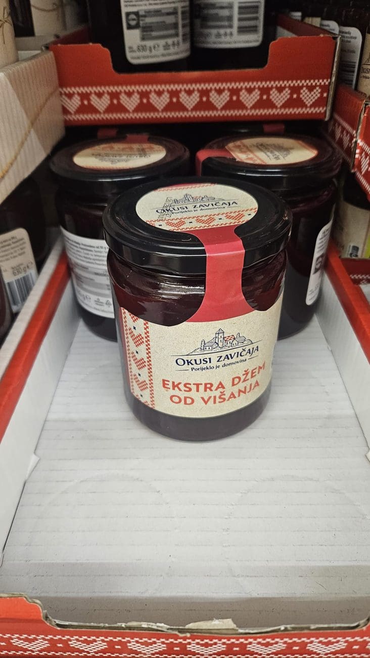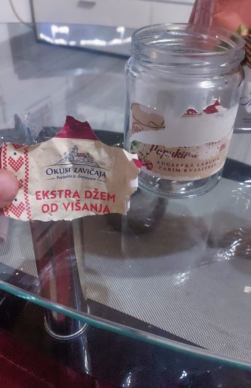Na temelju vidljivih ostataka na staklenki i našom pretragom na internetu došli smo do zaključka kako se radi o džemu od višanja koji se može kupiti u Litvi. Postavlja se pitanje, je li u staklenki ekstra džem od višanja hrvatskog ili litavskog porijekla.