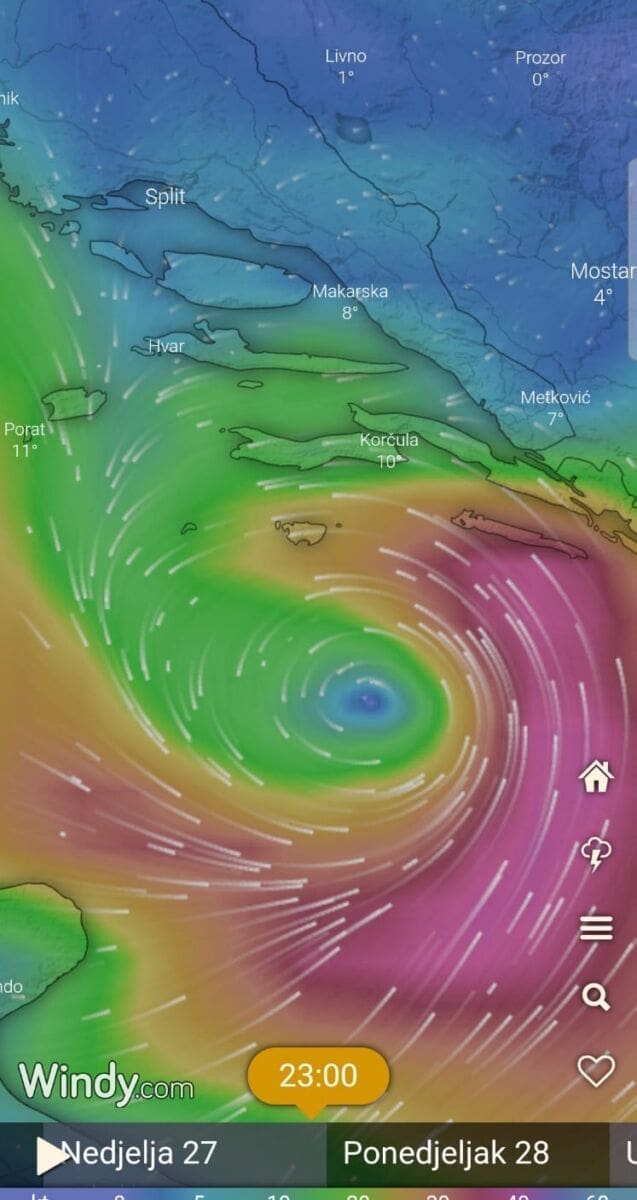 Ne događa se često da dva dana zaredom bilo gdje u Dalmaciji pušu olujni vjetrovi trećeg kvadratna, a upravo se to dogodilo u nedjelju i ponedjeljak. Prvo je u nedjelju navečer nakon juga zapuhao snažan lebić i pulenat i to zbog ciklone koja se s juga Italije premjestila nad Otrant, a zatim nad južni i srednji Jadran. Centar joj je u večernjim satima prošao oko Pelješca prema kopnu, a potom se ciklona popunila. No njen prolazak obilježila je snažna plima i visoki valovi od Pelješca do makarskog priobalja.