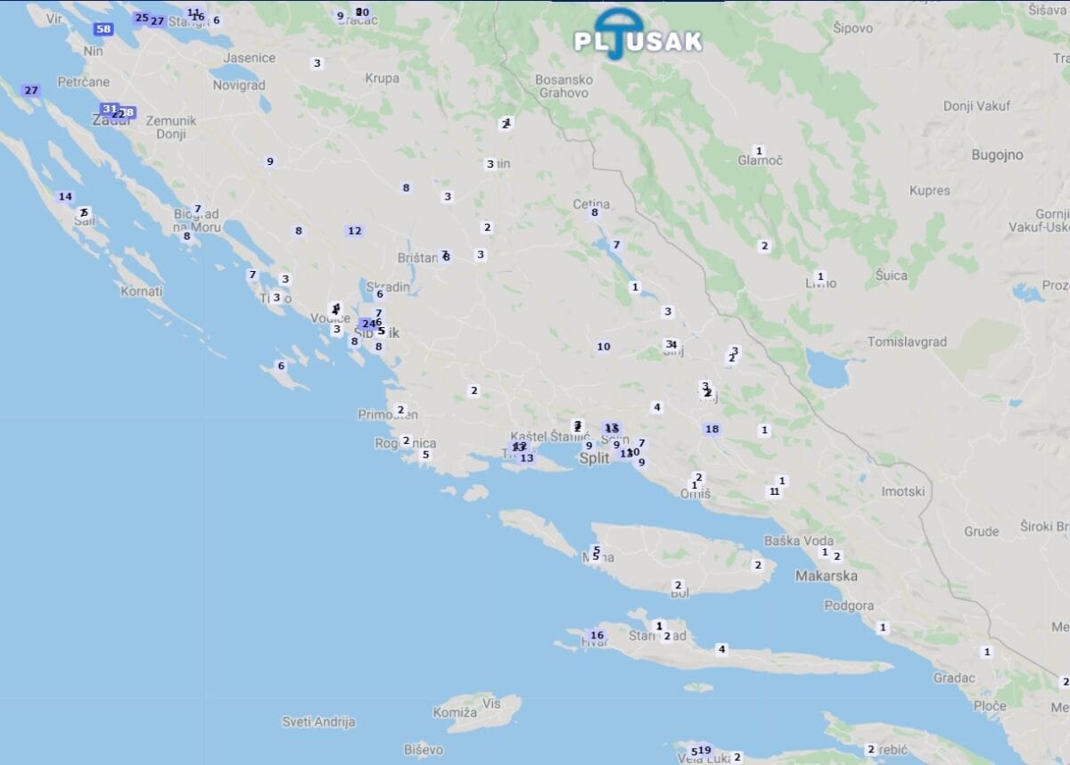 [P]onedjeljak je donio znatno manje oborina u odnosu na prethodni dan, ali je na zadarskom području palo preko 20 litara kiše po kvadratnom metru, a na širem splitskom preko 10. Najviše je palo u Mulu kod Nina, čak 58 litrara po kvadratnom metru.