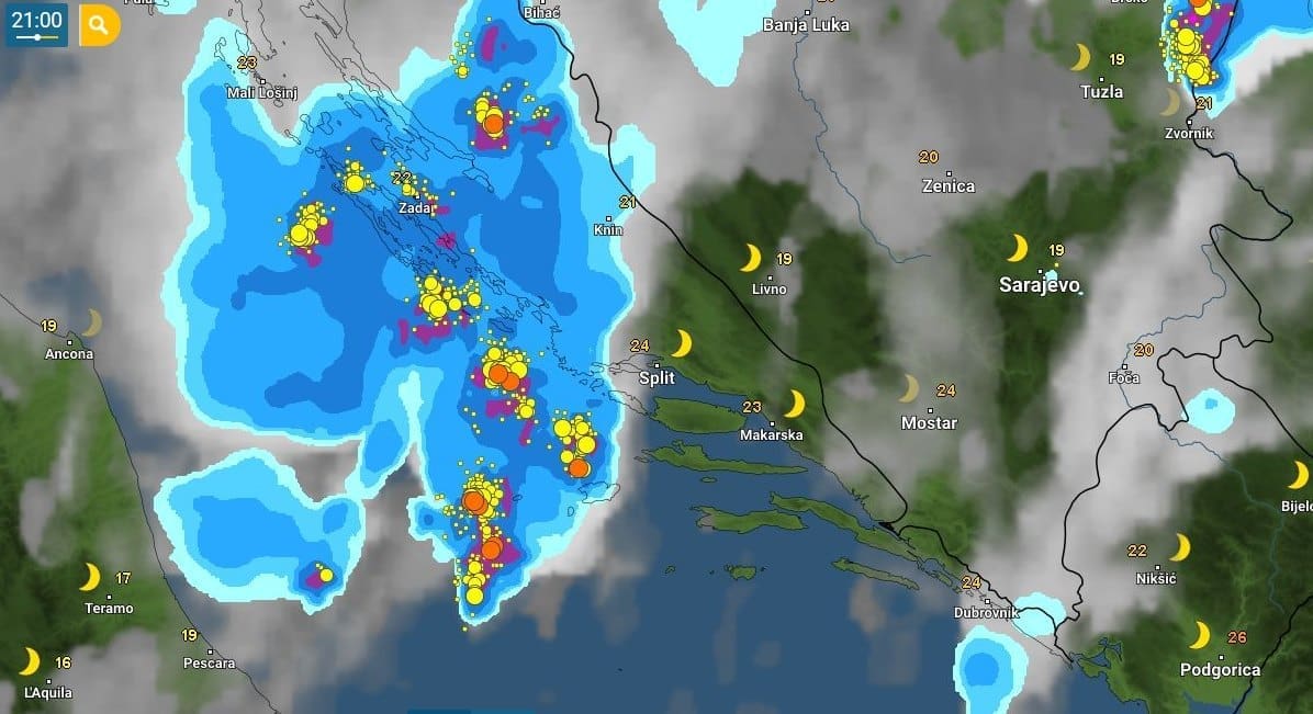 Kasno poslijepodne olujni oblaci razvili su se nad zapadnom stranom Jadrana. Nošen snažnom jugozapadnom visinskom strujom, olujni sustav stigao je već nad akvatorije dijela sjeverne i srednje Dalmacije, te bi do sredine noći mogao donijeti i izraženije neverine ponegdje na obali i u Zagori. U predjelima koje će zahvatiti neverini, u kratko vrijeme može pasti preko 30 litara kiše po kvadratnom metru, a ne isključuje se ni mogućnost tuče.