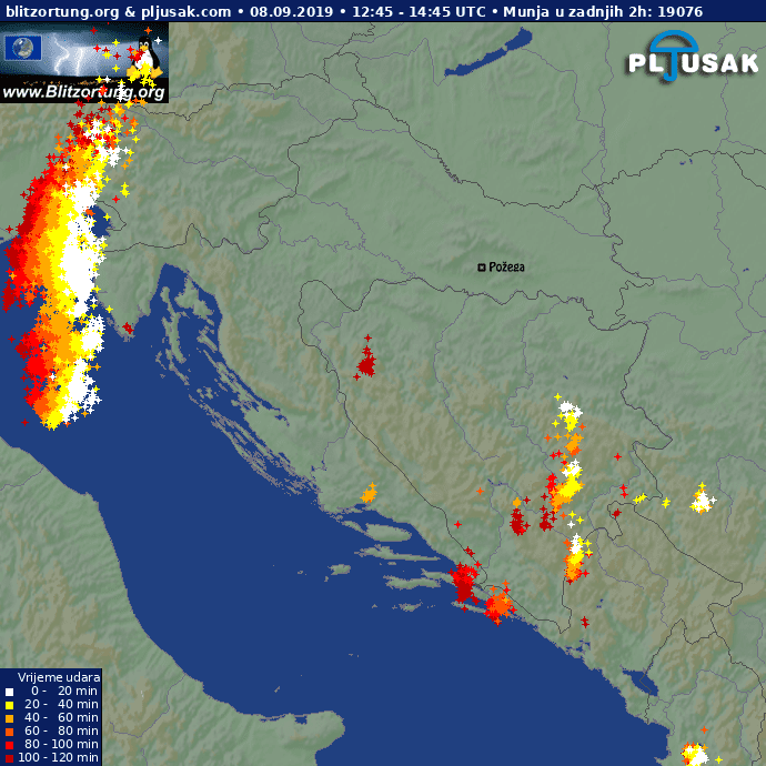 Oko 10 sati iznimno snažna grmljavinska ćelija koja je iznjedrila više od 11 000 munja u samo 2 sata razvila se na moru jugozapadne Istre. Grmljavinska ćelija zahvatila je krajnji jug Istre, ali i zaobišla Pulu gdje je palo samo 9 mm kiše. Kasno poslijepodne nova linija grmljavinske nestabilnosti prišla je Istri sa zapada, te se postupno premještala prema istočnoj obali i Kvarneru. Oko 16 sati na moru zapadno od Istre došlo je do razvoja izražene frontalne naoblake uz veliku grmljavinsku aktivnost. Fronta se zatim u iduća 2 sata premjestila preko zapadne i južne Istre donijevši više od 15 000 udara munja u samo 2 sata.