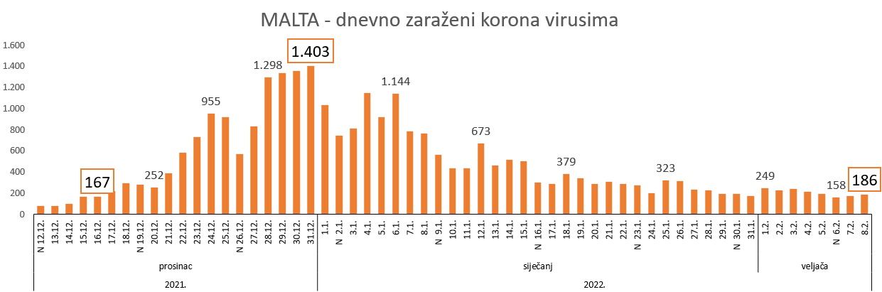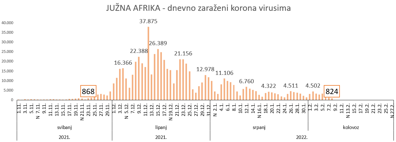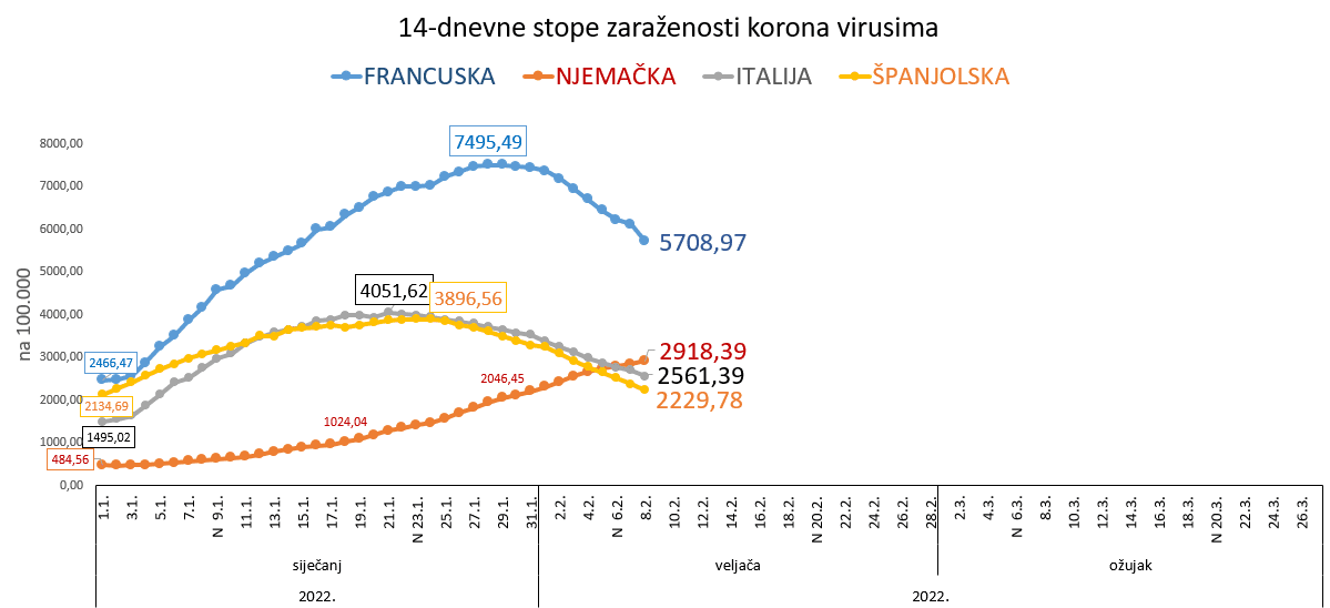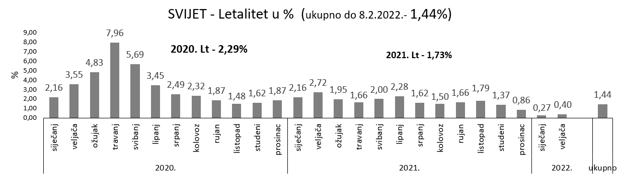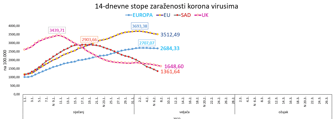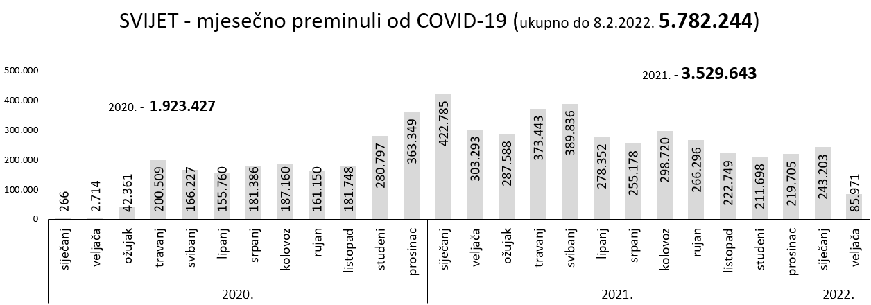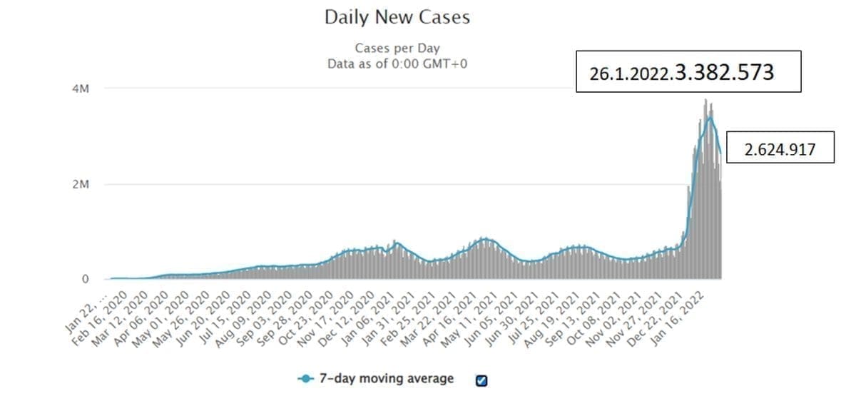 Grafikon dnevnog broja zaraženih u Svijetu pokazuje da je broj zaraženih u Omikron epidemijskom valu dosegnuo vrhunac 26. siječnja. Krivulja silaznog kraka epidemijskog vala traje već dva tjedna i 8. veljače dnevni broj zaraženih bio je 2.624.917.