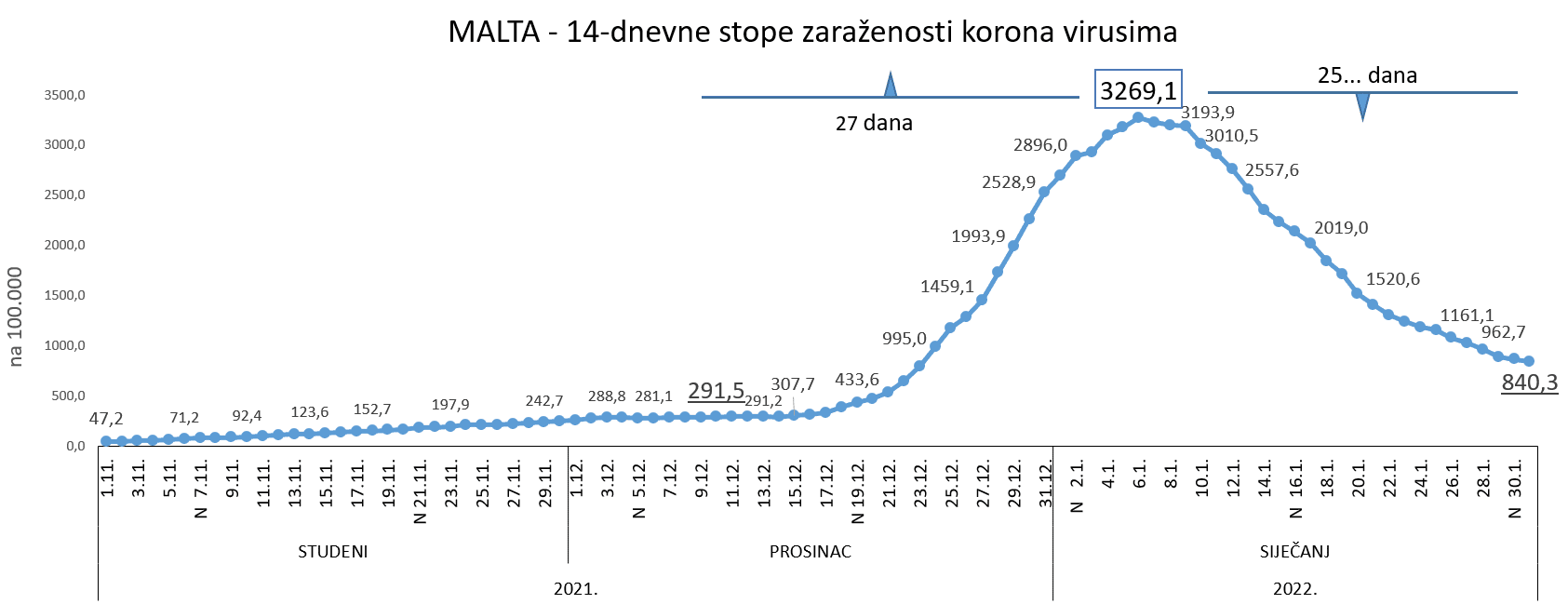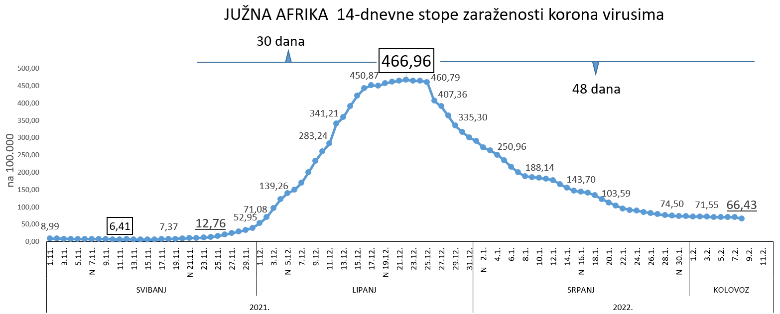 Od 13. prosinca 2021. kada je započelo povećanje dnevnog broja zaraženih do 8. veljače prošlo je 57 dana, nešto manje od dva mjeseca. Uzlazni krak Omikron vala imao je strelovit uzlet, a kako vidimo i silazni krak ima jako ubrzano smanjivanje, gotovo strmoglav pad. Izuzetno brzo šireći Omikron soj virusa se potvrdio svojom brzinom, gotovo eksplozivnošću u nastupu. Po ispoljenom izgleda da je jednako brz u smanjivanju broja zaraženih tj. u svom iščezavanju. Tako bi čitav epidemijski Omikron val mogao u cijelom Svijetu trajati manje od tri mjeseca što je najkraće vrijeme trajanja epidemije gripe. Omikron epidemija bi po duljini trajanja mogla biti jedna ekspres epidemija.