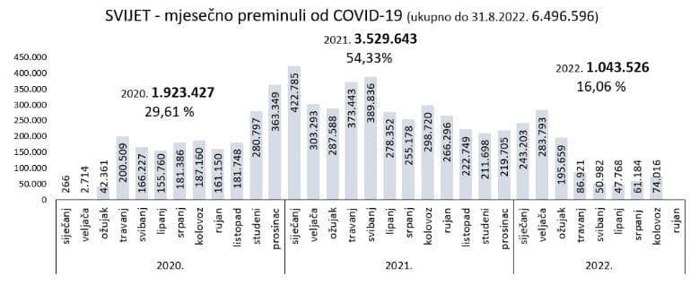 Od prosinca 2021. godine Omikron virus pandemija caruje Svijetom punih devet mjeseci. Kroz osam mjeseci 2022. godine Omikron virusima zaraženo je cca 320 milijuna stanovnika Svijeta. To je više od polovice (52,56%) svih zaraženih kroz svo vrijeme trajanja korona pandemije s ukupno 608 milijuna zabilježenih zaraženih stanovnika Svijeta. Kroz osam mjeseci preminulo je nešto više od milijun bolesnika od COVID-19 što je jedna šestina (16,06%) od ukupno cca 6 milijuna preminulih.