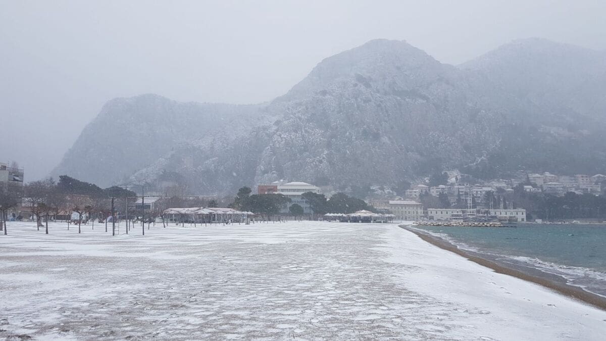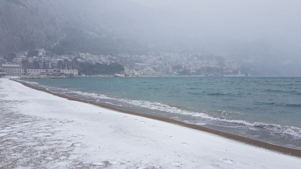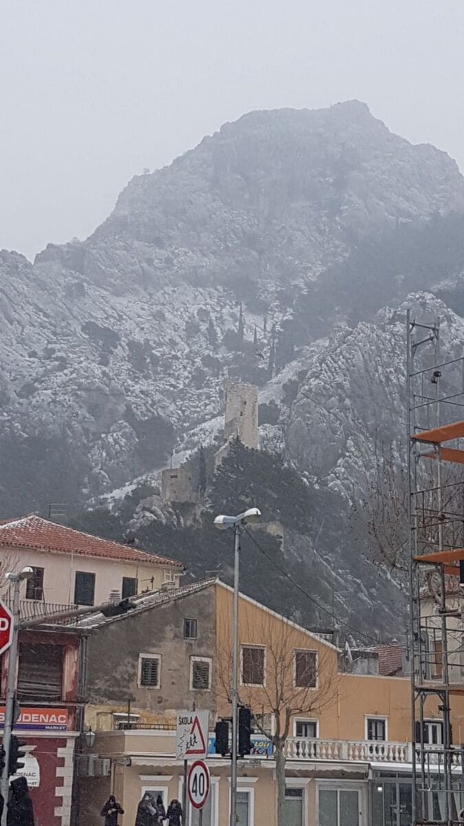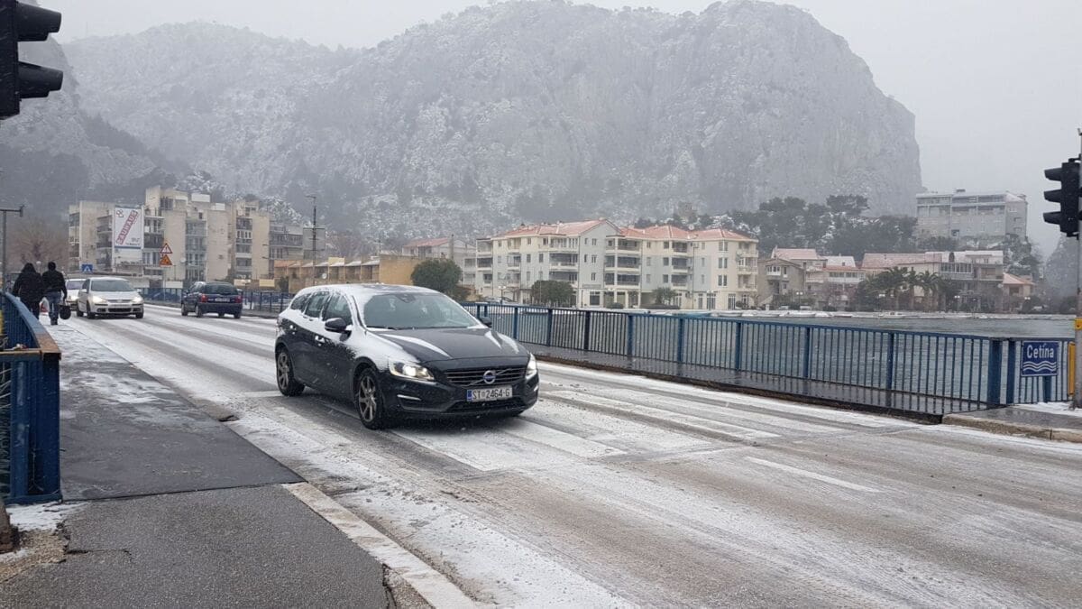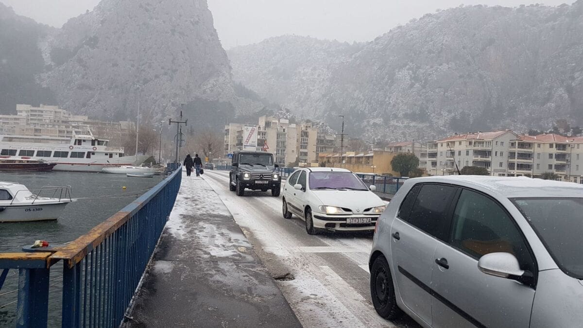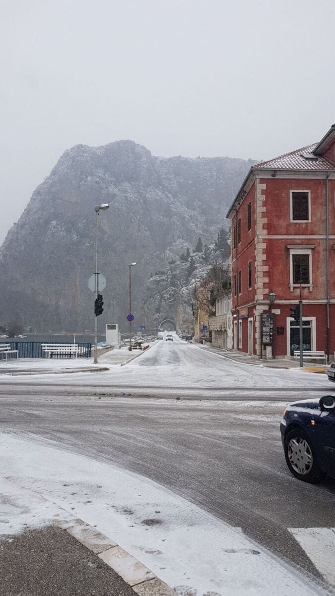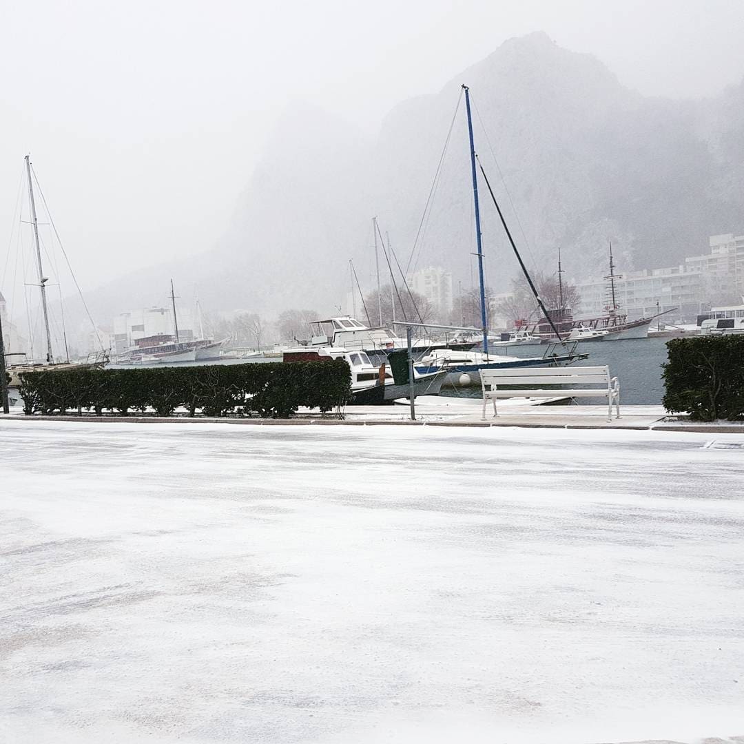 Omiš je dobio prvi snježni pokrivač od 2012. godine! Snijeg pada gotovo cijeloga dana pa se grad na ušću Cetine zabijelio. Temperatura je u gradu pala na 2 stupnje ispod nule, a Borak je bio još hladniji s -4°C.