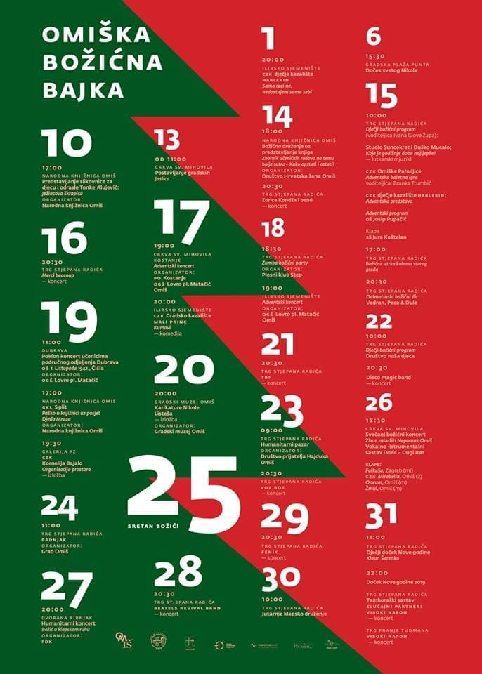 Prosinac u Omišu bit će čaroban i vesel: pjesmom ćemo pozdraviti dolazak sv. Nikole brodom na gradsku plažu Punta, povodom blagdana sv. Lucije postavit će se jaslice kod Crkve sv. Mihovila - rad više akademskih kipara i slikara iz Likovne kolonije Mimice, a Omiški božićni grad u petak 14.12.2018. u 20:30 h svojim nastupom otvorit će Zorica Konža i bend.