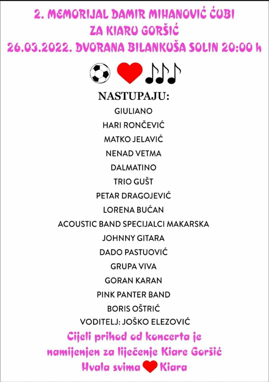 "To će biti cjelodnevni turnir u Dvorani kraljice Jelene u Solinu, a navečer će u Bilankuši biti koncert na kojem će biti obitelj Kiare Goršić. Moram također naglasiti da nam je poglavarstvo Grada Solina maksimalno izašlo u susret", kazao nam je Frane Bućan.