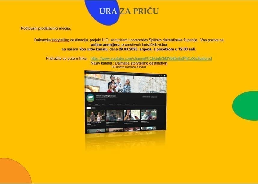 Dalmacija storytelling destinacija, projekt U.O. za turizam i pomorstvo Splitsko dalmatinske županije, organizira #UruZaPriču, online premijeru promotivnih turističkih videa na svojem YouTube kanalu. Održat će se u srijedu, 29. ožujka 2023., s početkom u 12 sati.