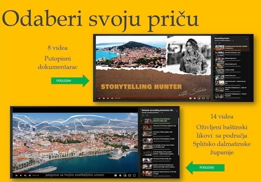 - Promotivni videi dio su online kampanje projekta Dalmacija storytelling destinacija, koja za cilj ima predstaviti Splitsko-dalmatinsku županija kao destinaciju autentičnih priča. Ukupno će se prikazati 22 videa. Serijal videa koncepta 'Storytelling u muzejima' čini ukupno 14 videa, trajanja između 60 i 75 sekundi, a predstavljaju mikro-destinaciju kroz oživljenu povijesnu osobu u muzejima i na važnim baštinskim lokalitetima. Preostalih osam videa, u trajanju između šest i devet minuta, svojevrsni su putopisni dokumentarac pod nazivom Storytelling hunter te publiku kroz osam epizoda vodi na putovanje kroz SDŽ gdje sa Silvijom istražujuju autentične priče.