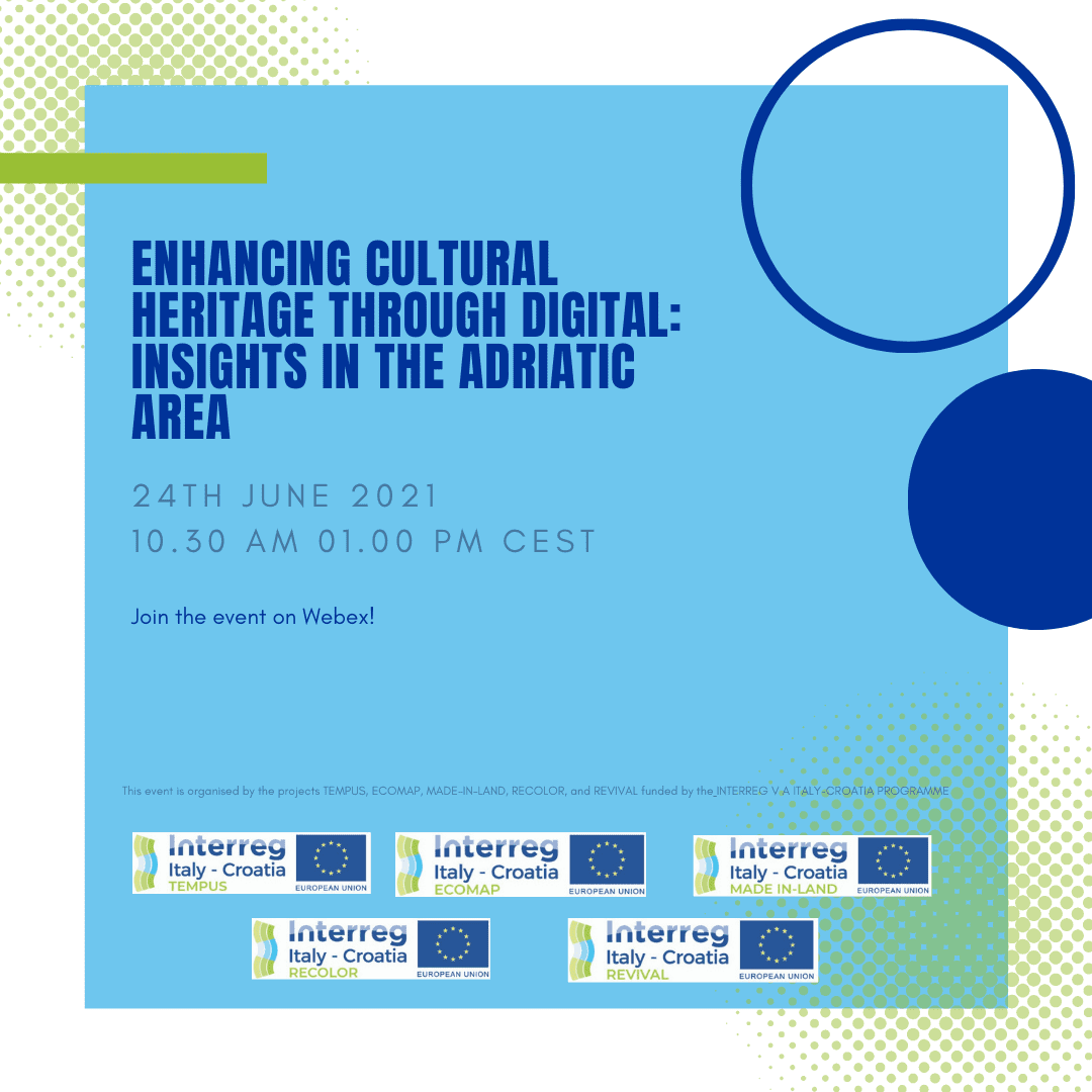 "Jačanje kulturne baštine kroz digitalizaciju: uvidi u jadransko područje" naziv je online konferencije koju 24. lipnja organiziraju sudionici čak pet prekograničnih projekataTEMPUS, ECOMAP, MADE-IN-LAND, RECOLORi REVIVALfinanciranih iz EU programa INTERREG V A ITALIJA-HRVATSKA. Ovom prilikomprojektni partneri iz obiju zemalja, Italije i Hrvatske, promovirati će korištenje IT tehnologija u virtualnim posjetima kulturnim ustanovama.