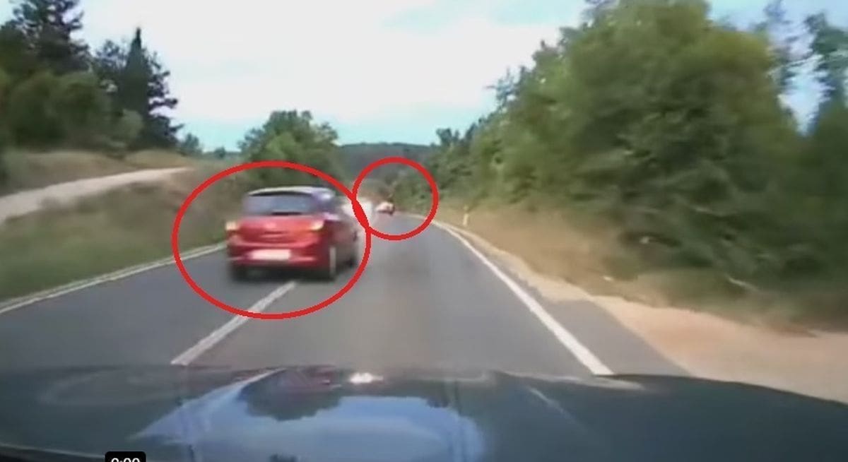 Vozačica crvene Seat Ibize odlučila se na pretjecanje osobnog automobila preko pune crte i skoro izazvala frontalni sudar. Nakon što je završila s manevrom, vratila se u desnu traku i nastavila pun gas prema motoristu ispred sebe.