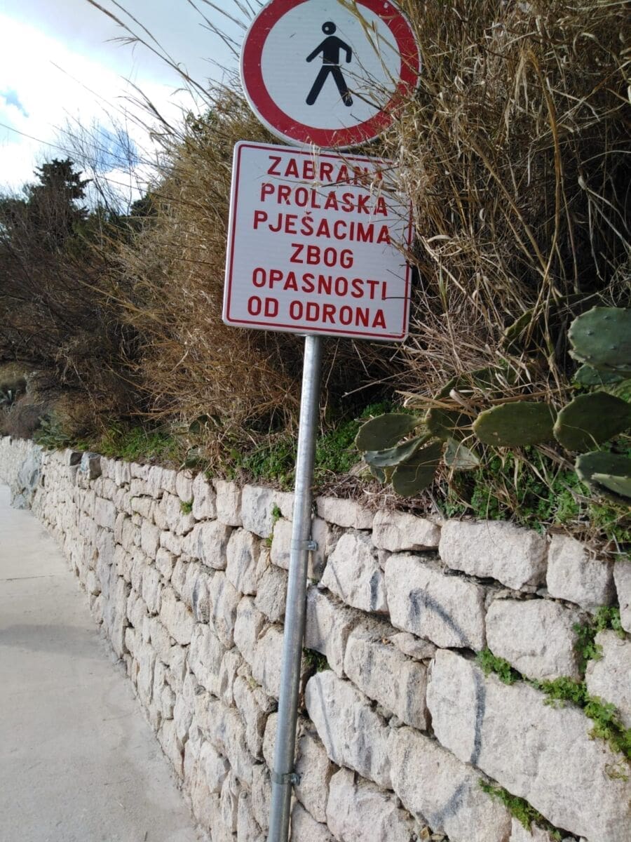 "Zabrana prolaska pješacima zbog opasnosti od odrona"- piše na znaku što znači samo jedno - od sada ovim dijelom šetnicom prolazite na vlastitu odgovornost! Ako vam padne kamen na glavu bit ćete sami krivi! Kako se radi o izrazito frekventnoj šetnici koju dnevno koriste tisuće Splićana, nije jasno koliko će dugo ovakva zabrana opstati. Nadamo se što kraće, i da će sanacija privatne parcele početi što prije.