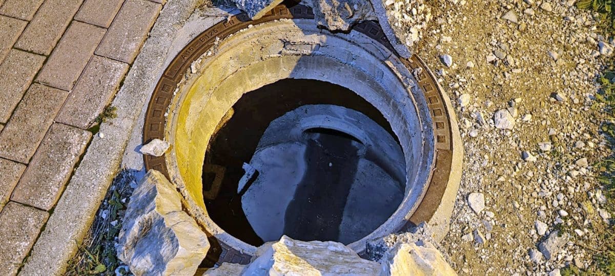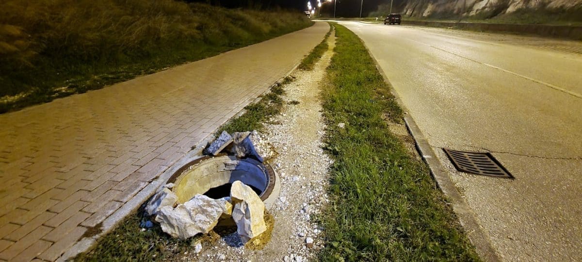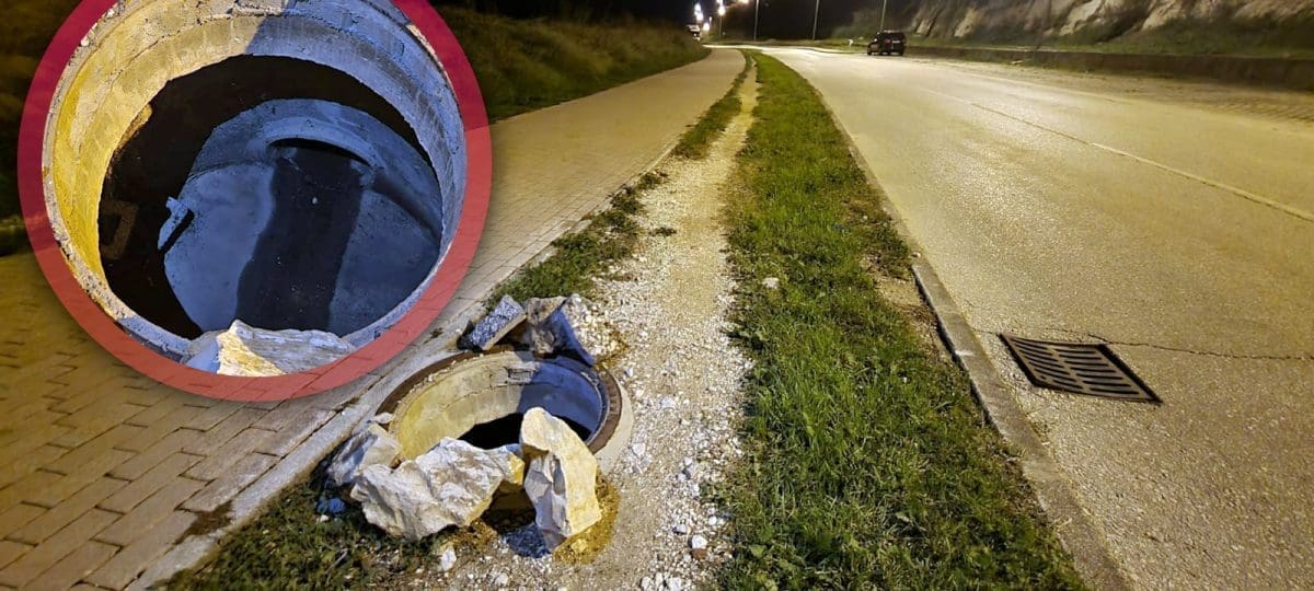 Prava opasnost vrebala je sve koji su prolazili jučer stazom uz cestu preko Duilova. Naime, između nogostupa i ceste nalazi se nekoliko stotina metara dugačka zemljana staza, a sudeći prema viđenom, netko je ukrao veliki metalni šaht.