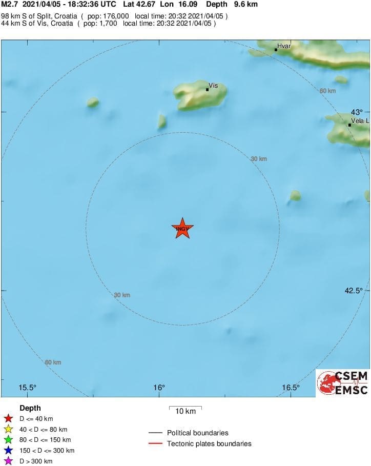 Novi potres dogodio se u ponedjeljak navečer u srednjem Jadranu, točnije u 20 sati i 32 minute.