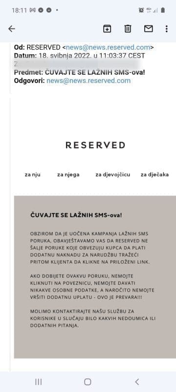 U mailu navode da je uočena kampanja lažnih SMS poruka te su obavijestili da Reserved ne šalje poruke koje obvezuju kupca da plati dodatnu naknadu za narudžbu tražeći pritom klijenta da klikne na priloženi link.