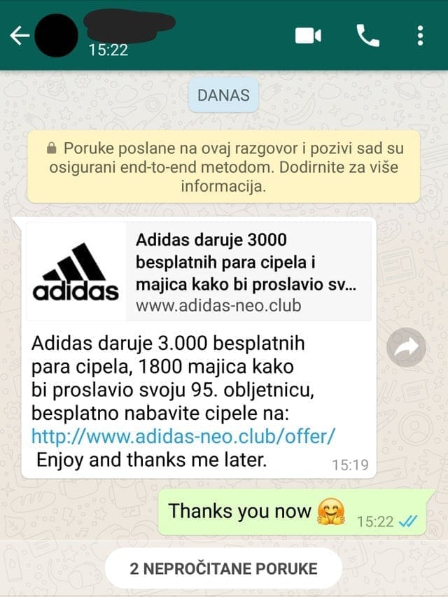 Mnogima je posljednjih dana stigla na WhatsAppu poruka: 'Adidas daruje 3000 besplatnih para cipela, 1800 majica kako bi proslavio svoju 95. obljetnicu, besplatno nabavite cipele na: http://www.adidas-neo.club/offer/'.