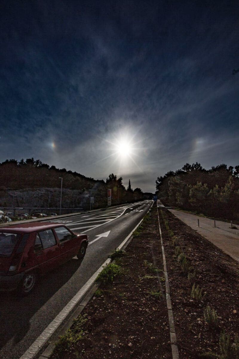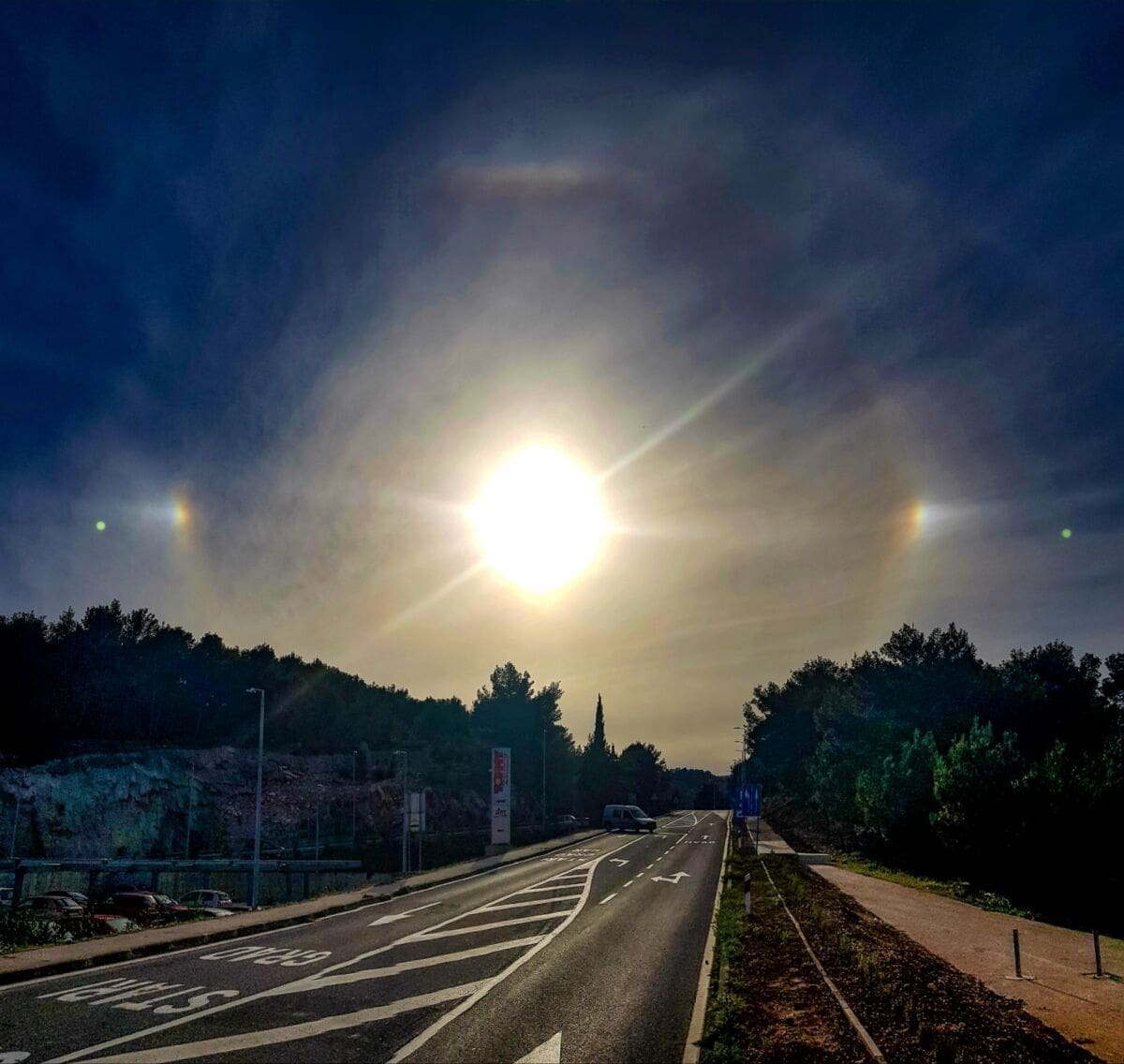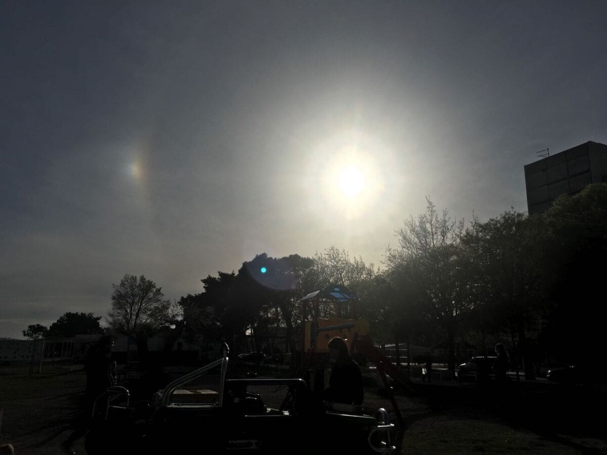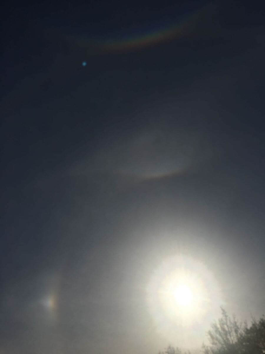 - Na većini fotografija može se vidjeti obični halo, polumjera 22° s pasuncima lijevo i desno. Sjajniji dio iznad Sunca je vjerojatno komadić gornjeg tangentnog luka.