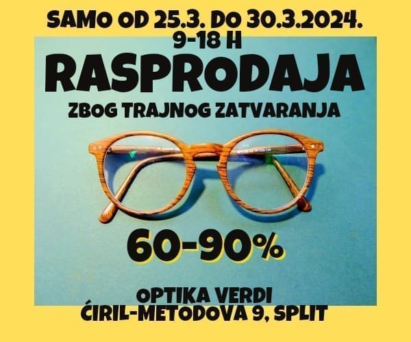 U tjednu od 25. do 30. ožujka, Optika Verdi poziva vas da iskoristite priliku i pomognete im isprazniti police prije nego što trajno zatvore svoja vrata. Sav asortiman dioptrijskih okvira na popustu je od 60 do 90 %.