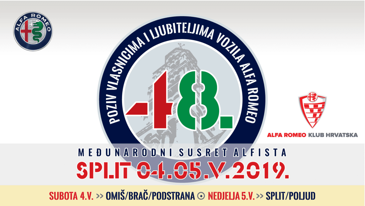 Alfa Romeo klub Hrvatska koji okuplja ljubitelje vozila marke Alfa Romeo 4. i 5. svibnja organizira susret alfista, koji je dio 48. međunarodnog susreta alfista Split/Podstrana.