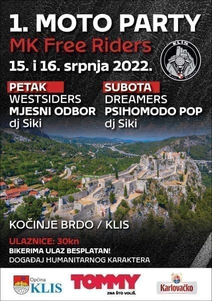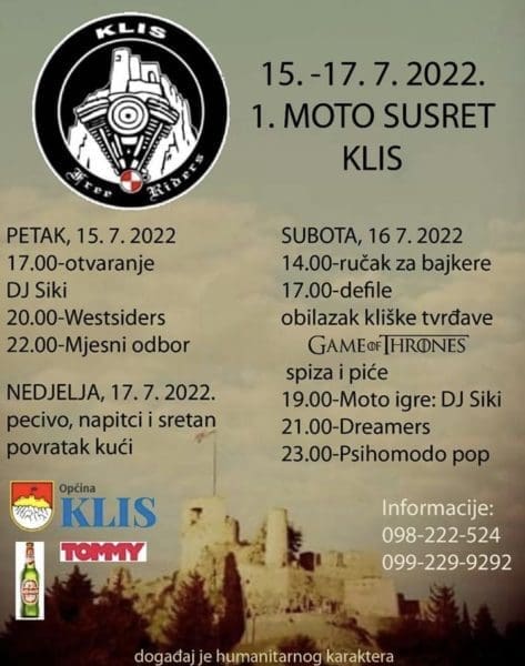 U organizaciji moto kluba Free Riders, u petak i subotu 15. i 16.7. u Klisu na Kočinjem brdu, održat će se 1. Moto susret Klis 2022. U dva dana očekuje se dolazak velikog broja posjetitelja, bikera, moto entuzijasta i svih onih željnih dobre zabave, rock n´rolla, druženja i prijateljstva.