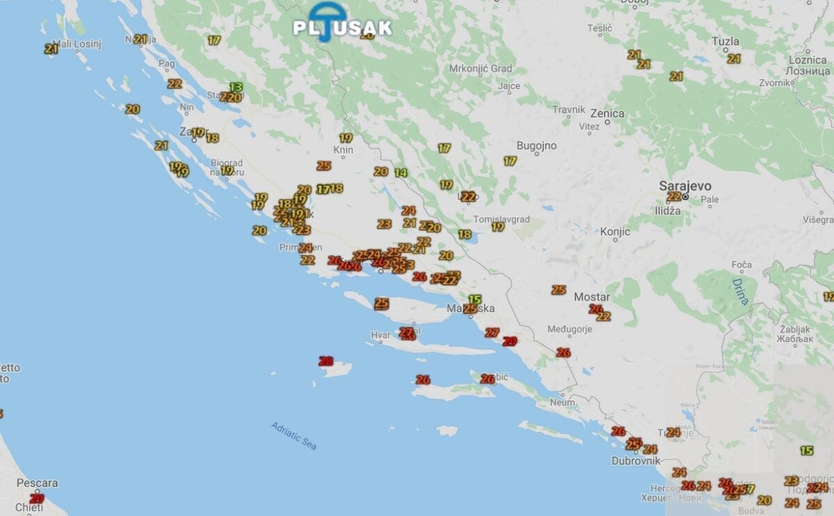 Prolaskom fronte uslijedio je izražen pad temperature zraka. Primjerice, u 22 sata u Splitu je izmjereno 27 Celzijevih stupnjeva, a onda je uslijedio izražen pad temperature. U okolici Šibenika temperatura je pala na 19°C.