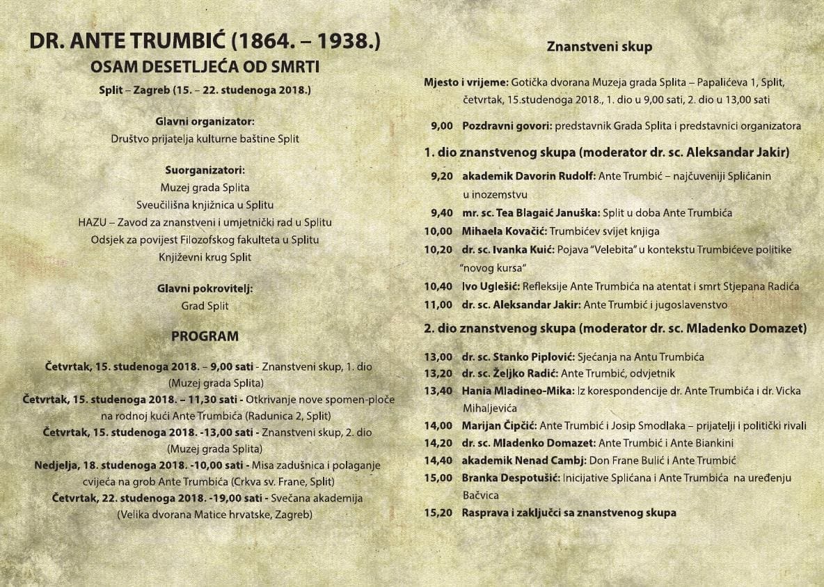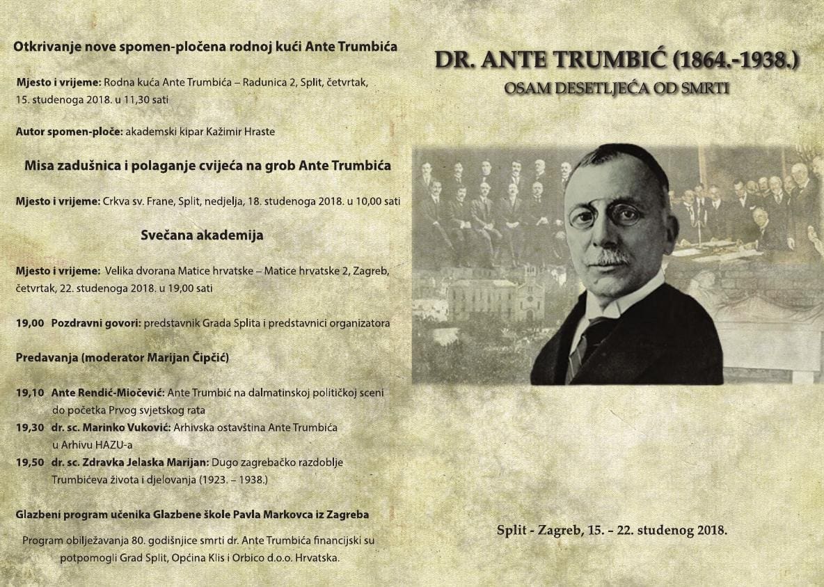 Ove godine se obilježava 80. godišnjica smrti dr. Ante Trumbića, jednog od najistaknutijih Splićana 20. stoljeća. Ante Trumbić djelovao je više od pola stoljeća, te je obilježio politički život Splita, Dalmacije i Hrvatske u teškim i bremenitim vremenima. Njegova životna misija bila je očuvanje teritorijalnog integriteta i rješavanje hrvatskog pitanja. Imao je andu, prgavost, dišpet, ali i aristokratsku profinjenost. To su mu neki uzimali kao slabost i umišljenost, a on je zapravo uvijek bio svoj. Trumbićev sprovod 1938. godine ujedinio je čitavu Hrvatsku, a s preko 40.000 ljudi bio je najmasovniji posljednji ispraćaj kakvog je Split do tada vidio.