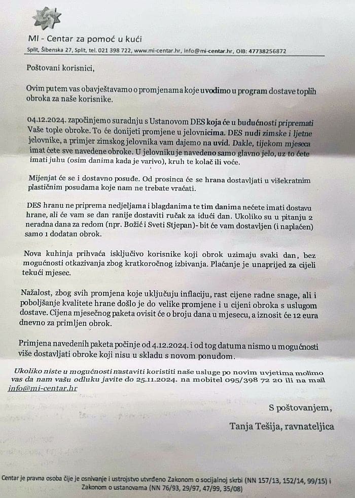 Primjena navedenih paketa počinje od 04.12.2024. i od tog datuma nismo u mogućnosti više dostavljati obroke koji nisu u skladu s novom ponudom", stoji, između ostalog, u Tešijinom pismu u ime Centra za pomoć u kući.