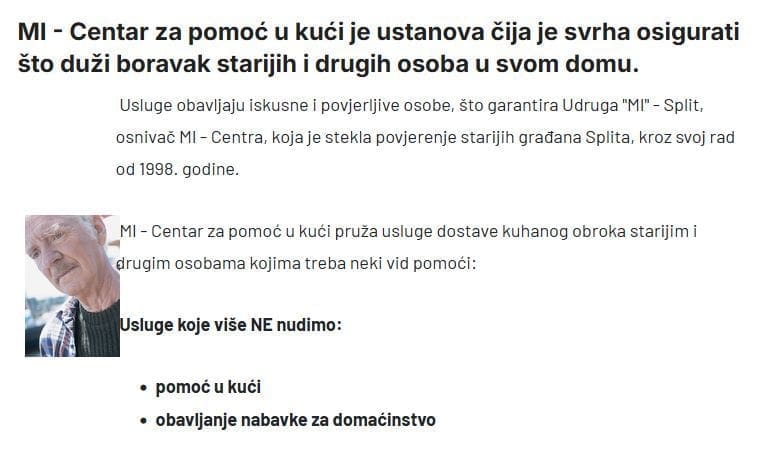 Grlati umirovljenici rogobore jer im mirovina ne prati rast plaća ni troškove života. Oni tihi kojima splitska Udruga MI, odnosno njihova ustanova Centar za pomoć u kući, dostavlja ručak, i dalje šute. Vjerojatno od šoka koje im je pribavilo cirkularno pismo ravnateljice Tanje Tešije.