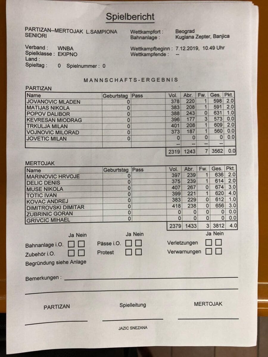 Izvanrednom igrom Mertojak je naprosto pomeo prvaka Srbije, Partizana u uzvratnoj utakmici 1/8 finala Lige prvaka Europe u klasičnom kuglanju. Nakon pobjede u Poljudu od 7:1, Mertojak je maksimalnim rezultatom od 8:0 i 250 više srušenih čunjeva (3812:3562) pobijedio i u kuglani domaćina na Banjici. Plasman u četvrtfinale ostvaren je već nakon prvog bloka, kad su Marinović i Delić ostvarili potrebna dva poena.