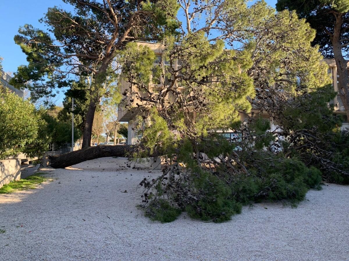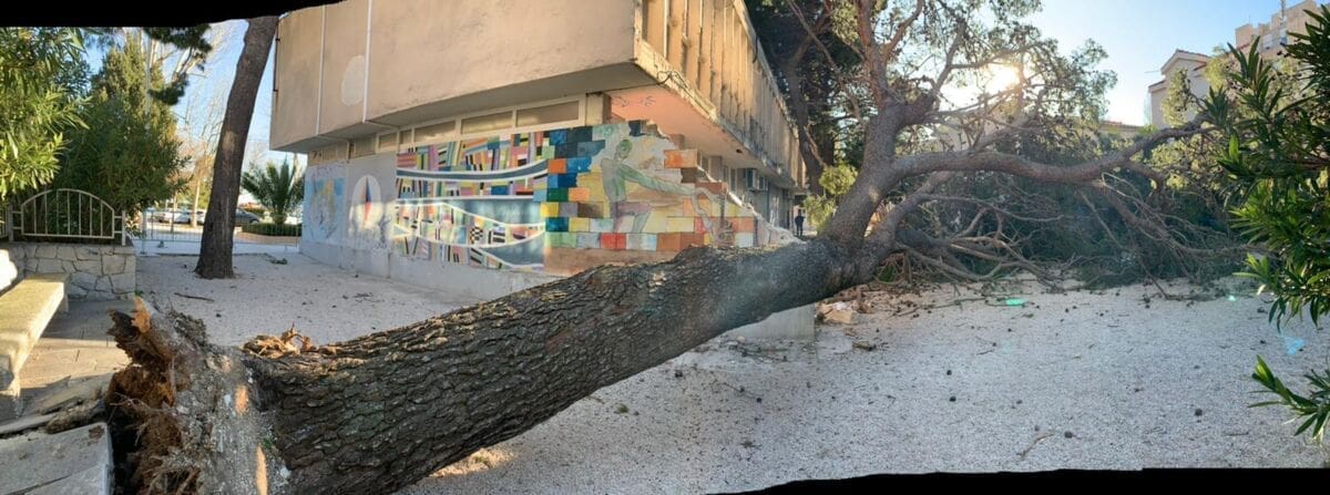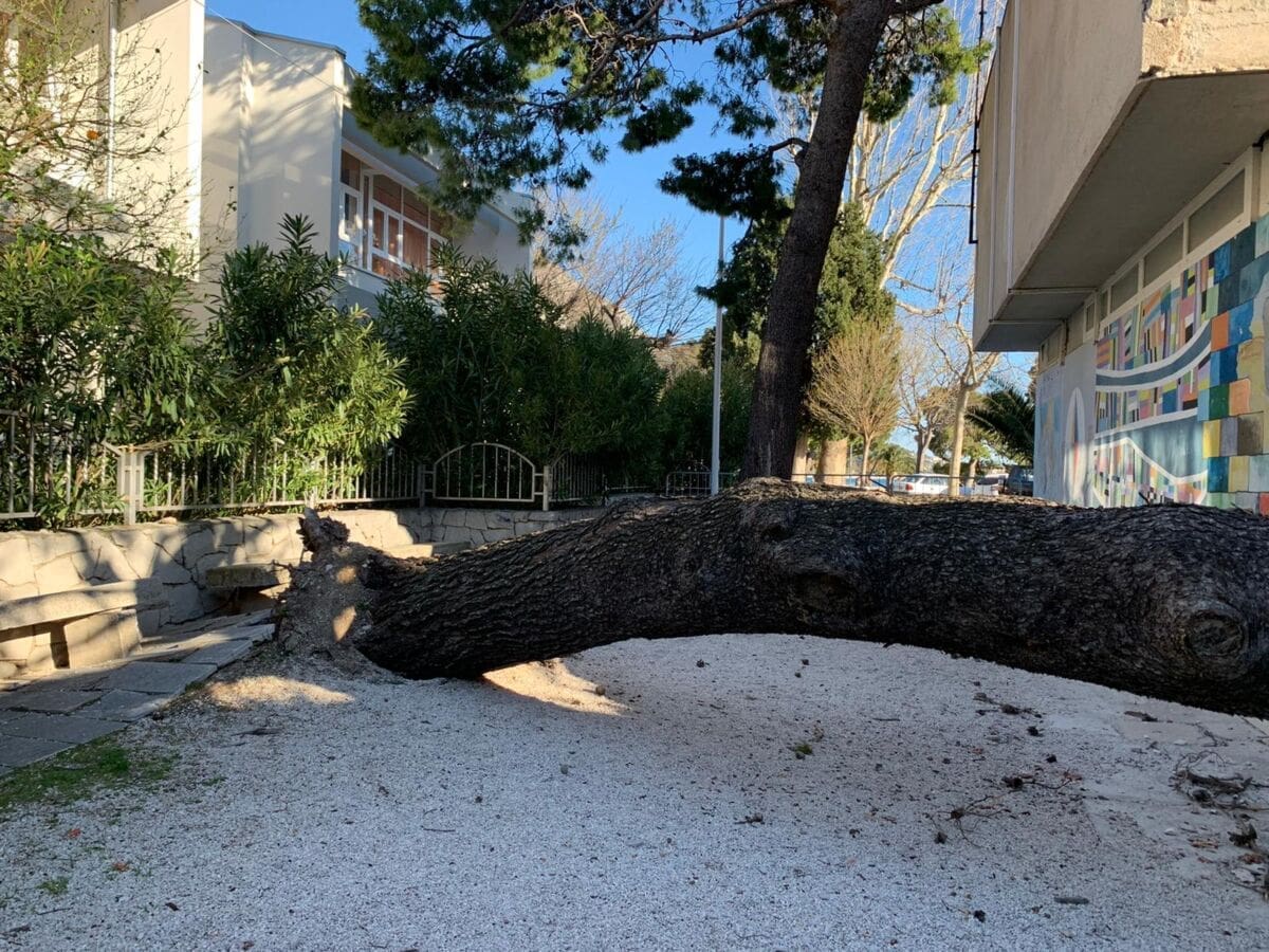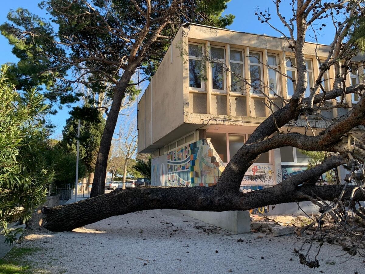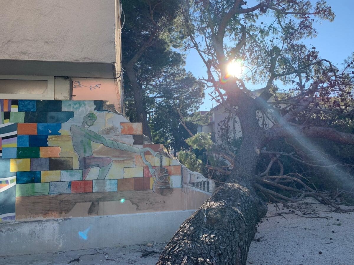 Nažalost, njezinu snagu osjetio je bor koji se nalazi kod osnovne i glazbene škole u Omišu. Bura ga je doslovno potrgala iz zemlje te naslonila na glazbenu školu, a nastradao je i produžetak zida, koji srećom nije od važnosti za statiku škole.