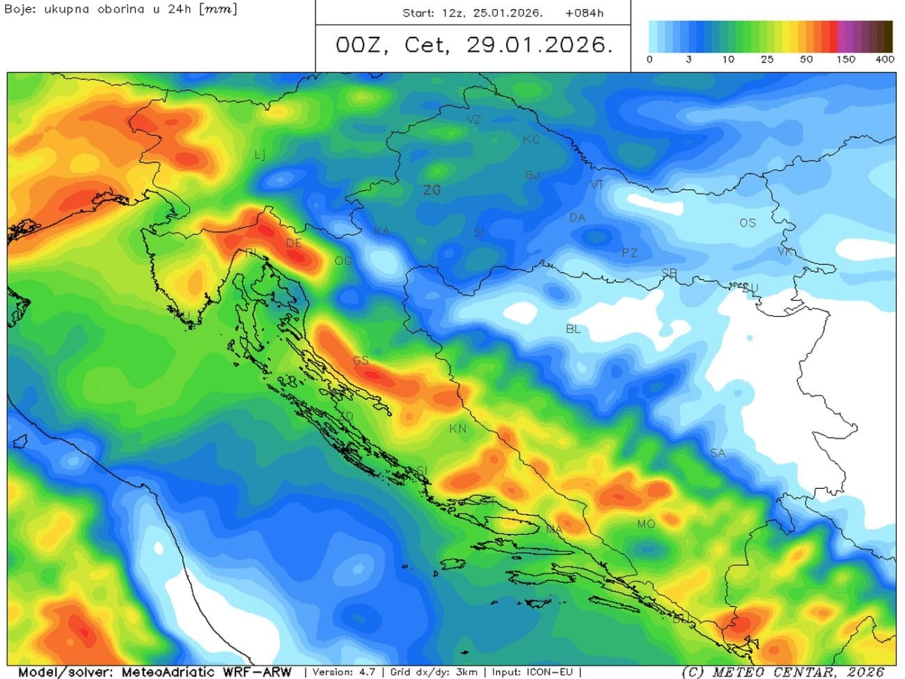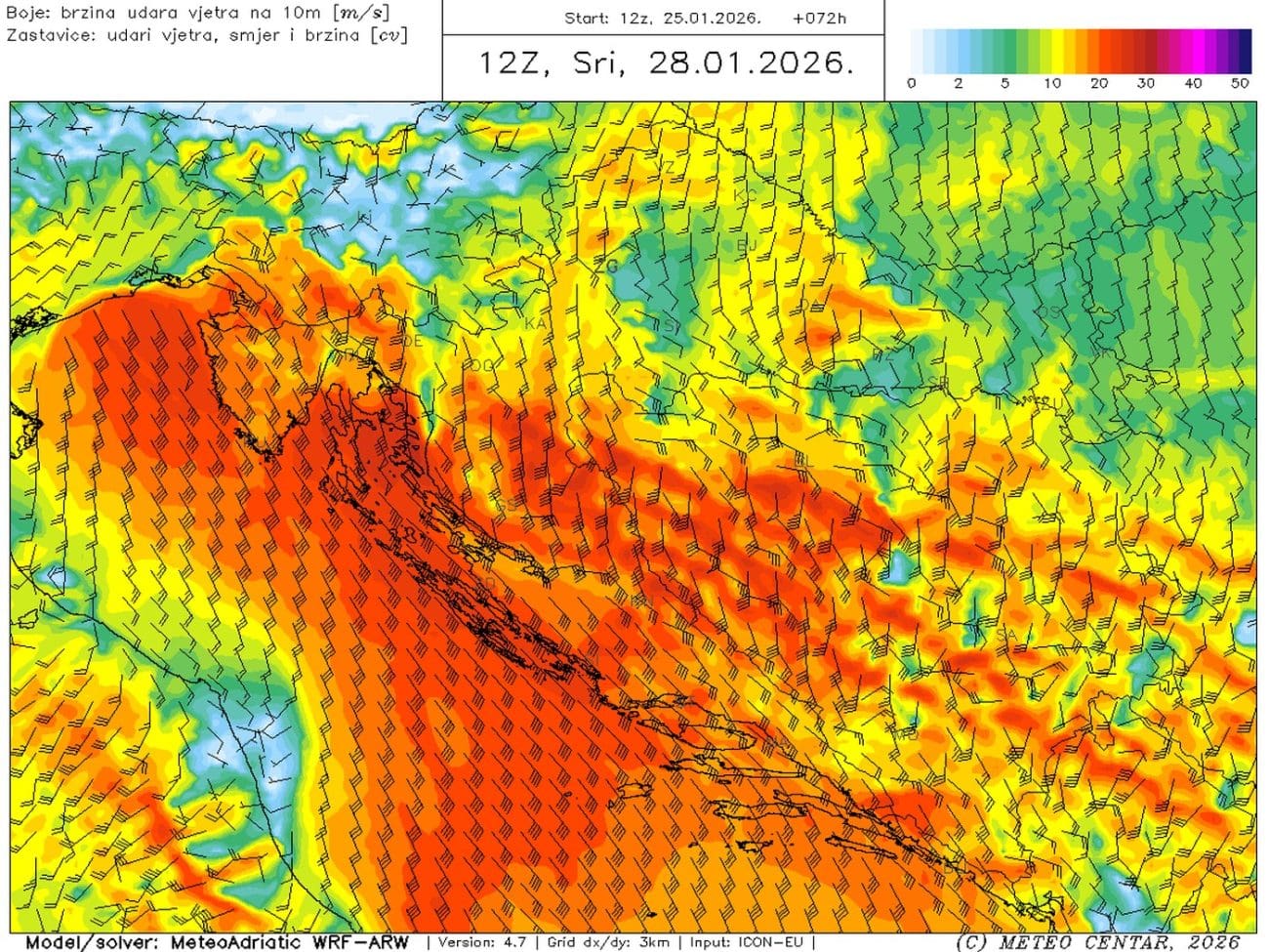 Srijeda će biti najnestabilniji dan tjedna. Bit će oblačno s čestom kišom, u drugom dijelu dana bit će i mjestimične grmljavine. Ponovno će biti obilnijih oborina, osobito u zaobalju i preko 50 litara po kvadratnom metru. Prijepodne jako jugo koje će imati olujne udare, na moru mjestimice i preko 100 km/h. U drugom dijelu dana okrenut će na lebić, a vjetar će tek navečer biti u slabljenju. Mjestimice se očekuje ciklonalna plima, odnosno plavljenje nižih dijelova obale. Bit će malo toplije u odnosu na utorak, osobito navečer.