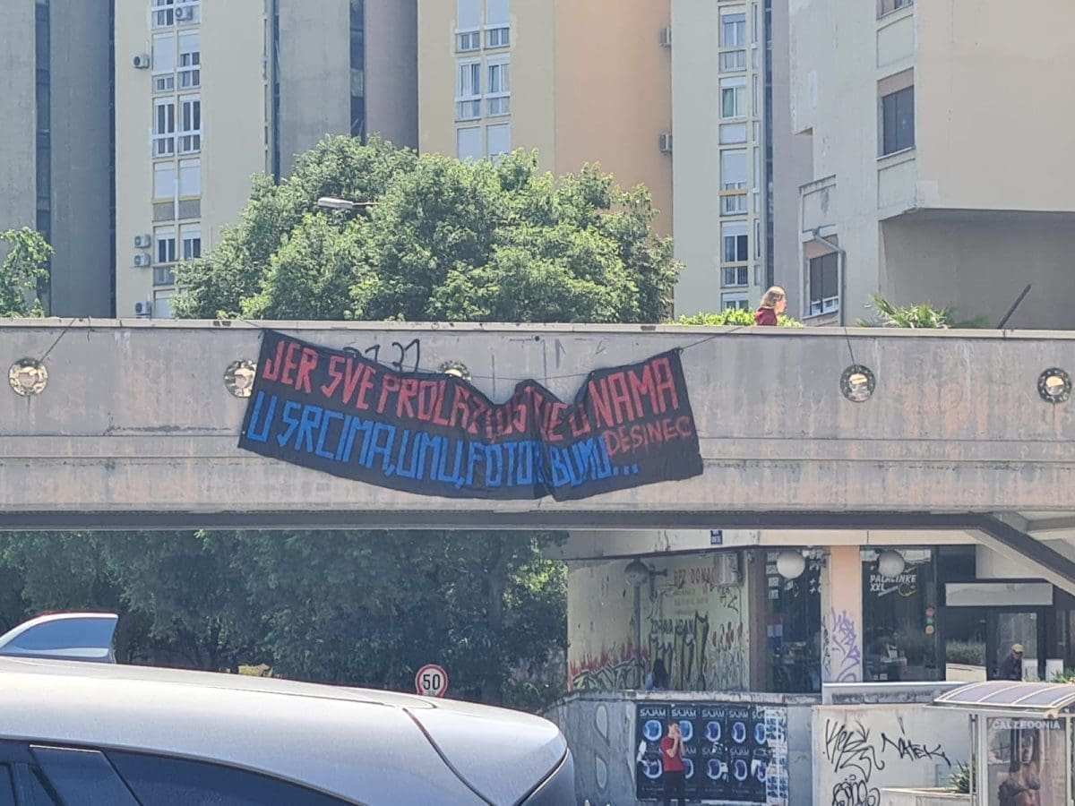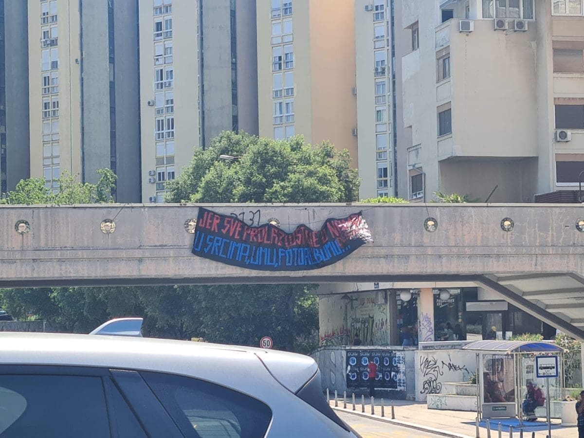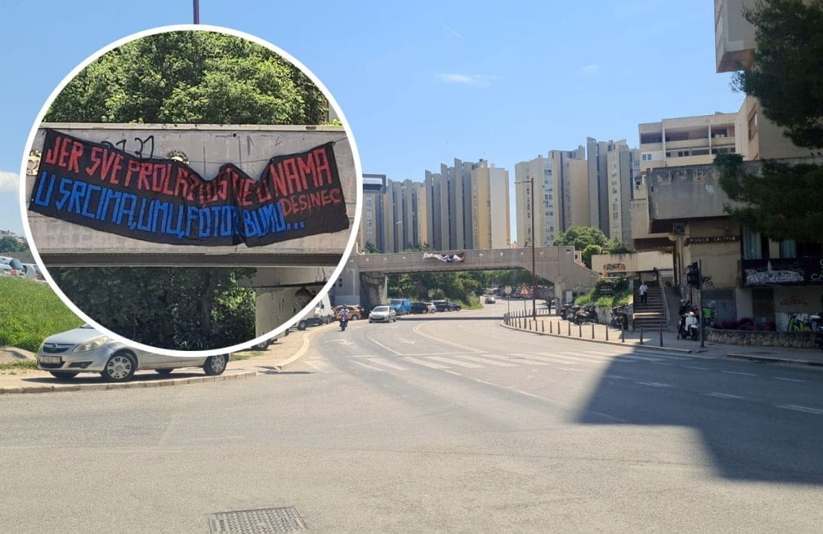 Povodom godine dana od sukoba navijača Torcide i policije na odmorištu autoceste A1, na mostu kod Kampusa osvanuo je transparent.