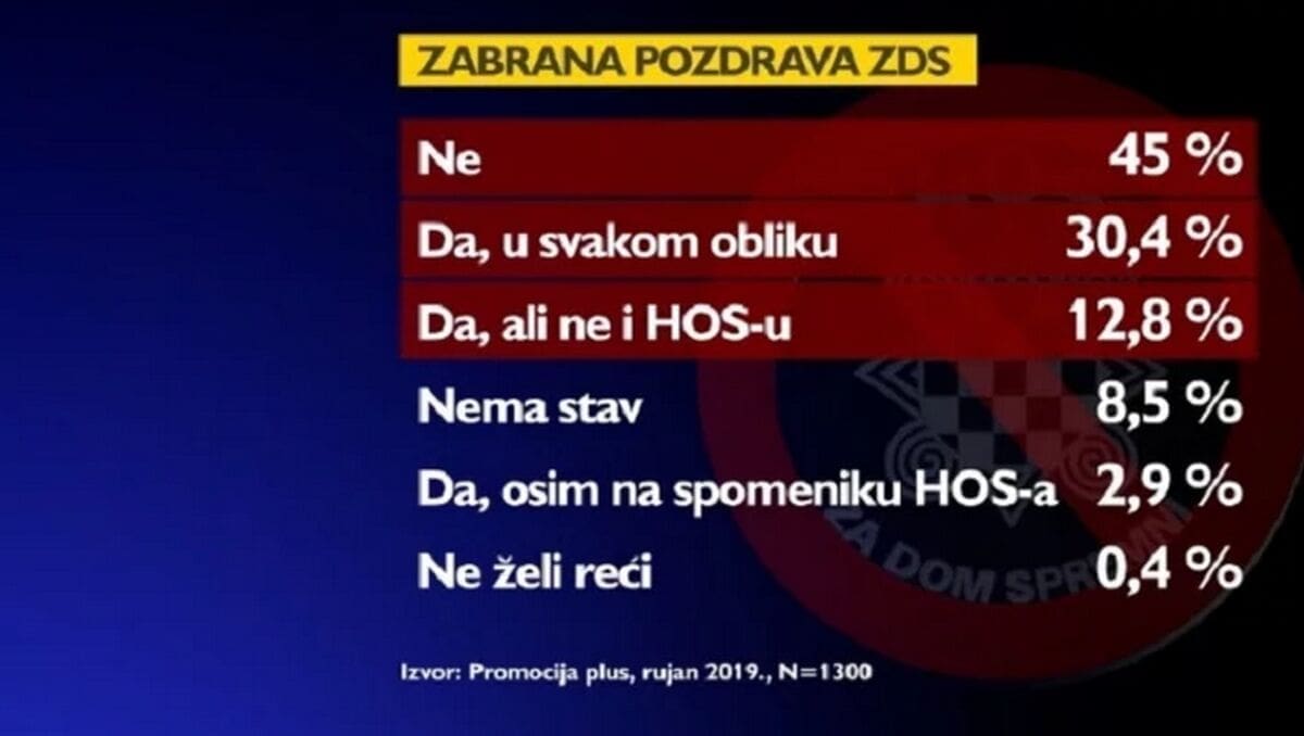 Zabrani pozdrava protivi se čak 45 posto ispitanih. Za zabranu u svakom obliku je nešto više od 30 posto ispitanika, a za zabranu pozdrava, ali ne u znaku HOS-a, na grbu i spomenicima poginulim pripadnicima, gotovo 13 posto ispitanih.