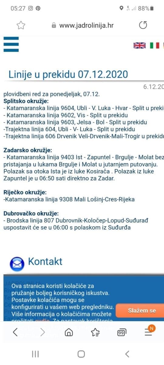 "Jutros, 07.12.2020. u 6 sati pokušala sam otići Jadrolinijinim trajektom "Šoltanka" s otoka Drvenik Mali. Nakon jučerašnjeg i prekjučerašnjeg nevremena kada trajekt nije vozio bilo bi normalno da je jutros linija ponovno aktivirana, budući je na moru bila doslovno bonaca, a u zraku ni najmanjeg vjetrića, a kamoli bilo kakvog vjetra. U luci se sakupilo još optimističnih putnika. Trajekt se naravno nije pojavio, jer su oni već sinoć znali da jutros neće ploviti iako je po vremenskoj prognozi trebalo doći do potpunog smirivanja vremena (prilažem Vam fotografiju s interneta s datumom 06.12.2020. kada je objavljeno da trajekt neće ploviti ni 07.12.2020). Također se ni u Agenciji za prodaju karata nitko nije pojavio, samo nas je dočekala obavijest da je linija u prekidu. Znači da se to sve znalo unaprijed iako je napominjem po vremenskoj prognozi trebalo doći do smirivanja vremena, što se i dogodilo", piše ogorčena čitateljica.