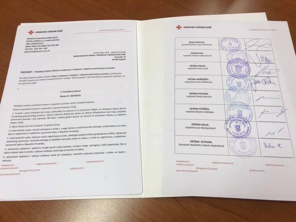 - Bez obzira na osam jedinica lokalne samouprave i bez obzira na stranačku pripadnost, pokazali smo jedinstvo. Nakon Zelenog Brača (projekta edukacije o važnosti razvrstavanja otpada), projekta po pitanju zaštite od požara , na inicijativu Crvenog križa Brač i Udruge roditelja djece s poteškoćama u razvoju ”Brački pupoljci, potpisali smo inicijativu za izmjenu članka 47. Zakona o prijevozu u linijskom i obalnom pomorskom prometu tako da isti u budućnosti regulira ostvarivanje prava na besplatan prijevoz za djecu s teškoćama u razvoju s prebivalištem na otoku kao i za darivatelje krvi s prebivalištem na otoku koji su krv darovali 36 (muškarci) ili 25 puta (žene) - komentirala je Marković za Dalmacija Danas nakon potpisivanja.