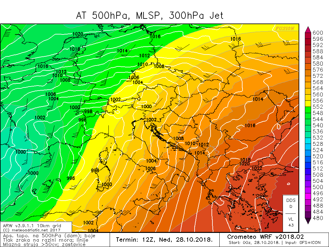 Temperature su visoke i u većini predjela su između 18 i 22 Celzijeva stupnja. Tlak zraka je u padu i na razini mora iznosi od 1003 hPa na zapadnoj obali Istre do 1013 hPa u Konavlima.